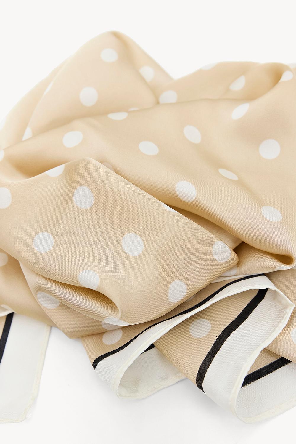 Cette écharpe beige présente un imprimé à pois classique avec des points blancs pour un look intemporel. Le matériau en polyester doux assure confort et apparence luxueuse. La forme carrée avec une bordure noire donne une finition chic. Stylez cette écharpe autour de votre cou avec une veste en jean pour un look chic décontracté.