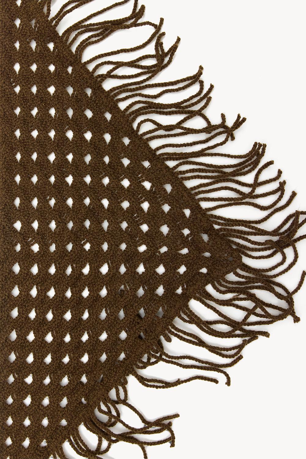 Cette écharpe marron foncé présente un motif au crochet avec des franges statement partout. Le design texturé avec des détails de franges mobiles crée un look bohème. Portez cette écharpe comme une ceinture avec un haut basique et un pantalon cargo pour une tenue prête pour le festival.