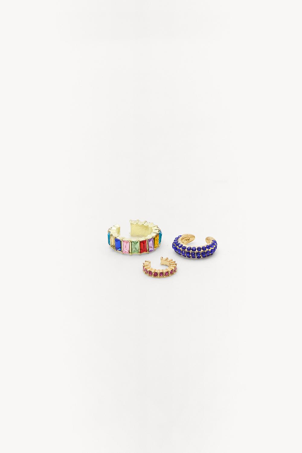 Cet ensemble de 3 manchettes d'oreilles dorées présente des pierres multicolores saisissantes pour un look affirmé. Les trois designs différents avec des accents colorés créent un style de fête d'oreilles audacieux. Portez-les ensemble pour un effet maximaliste ou mixez et assortissez pour une touche personnelle.