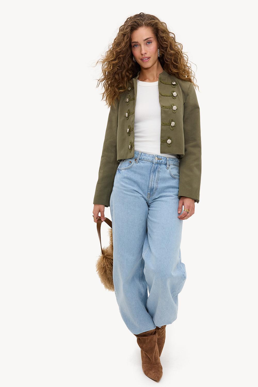 Veste verte avec boutons 69,99 €Ce blazer court vert a un design militaire affirmé avec une double rangée de boutons dorés. La coupe ajustée avec des cordons décoratifs donne à cette veste une touche luxueuse. La coupe courte crée une forme moderne qui s'associe parfaitement avec un jean taille haute. Portez ce blazer avec un tee-shirt blanc basique pour un look chic et décontracté.