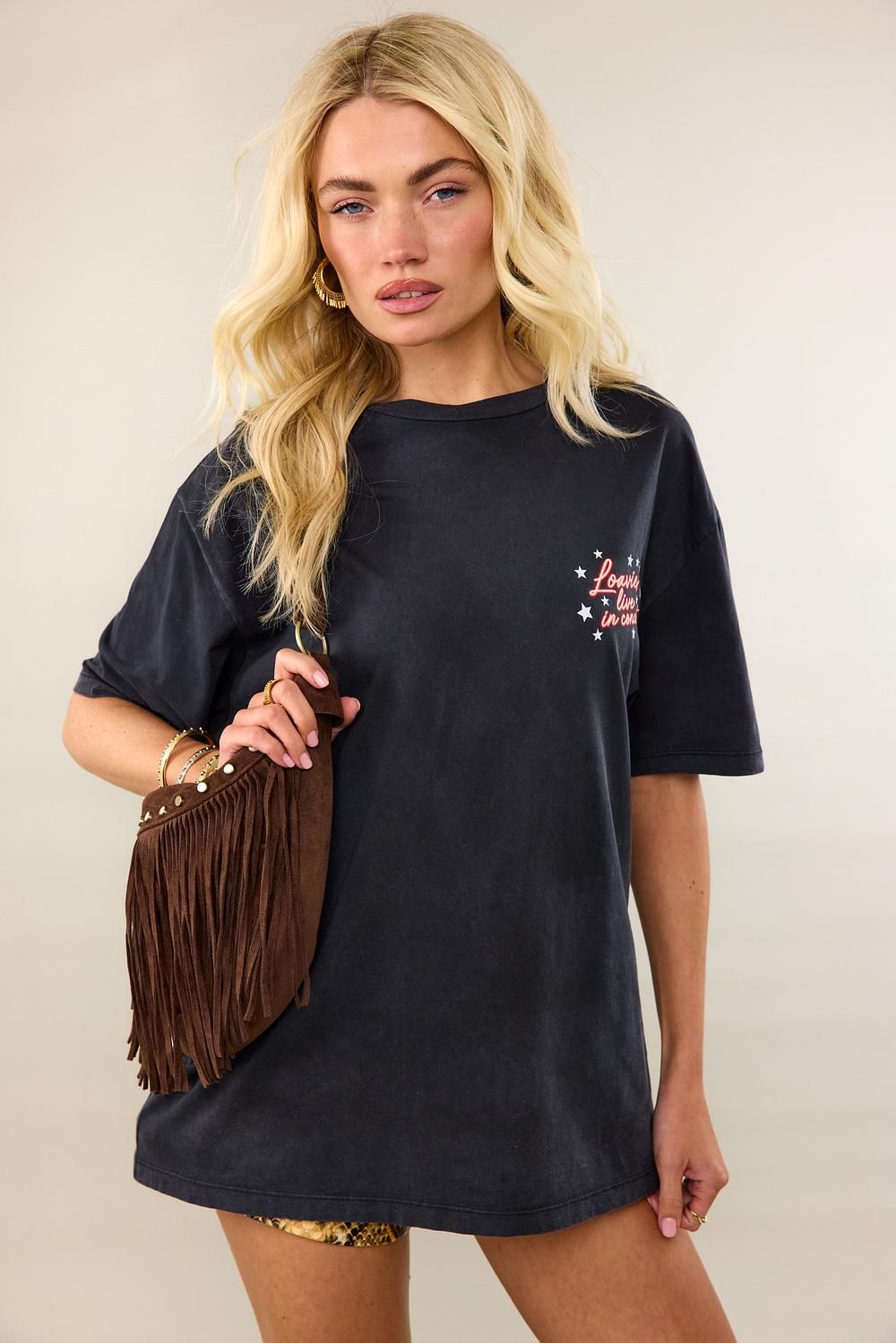 Ce T-shirt oversize en délavé acide présente un imprimé frappant 'LOAVIES AFTER HOURS Festival Valley 2026' au dos. La couleur gris foncé et la coupe décontractée donnent à ce T-shirt un look de festival vintage. Le petit détail du logo à l'avant crée une touche subtile. Associez ce T-shirt à une mini-jupe métallique et des bottes pour une tenue prête pour le festival.