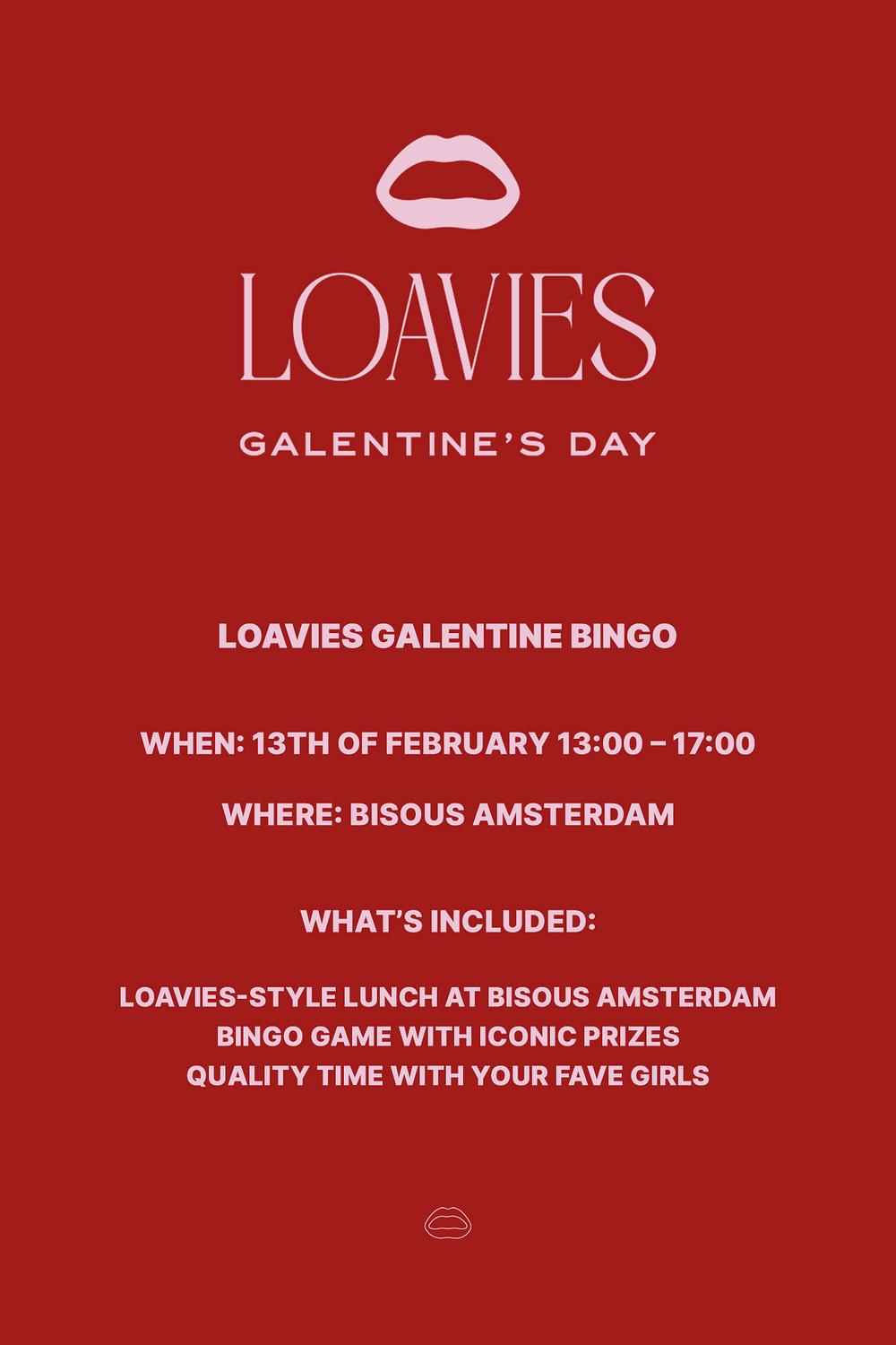 Profitez d'un déjeuner style LOAVIES chez Bisous Amsterdam avec vos meilleures amies, des moments de bingo audacieux et des prix ICONIQUES que vous voudrez absolument gagner. Attendez-vous à de la bonne nourriture et à toutes les bonnes vibrations. Parce que la vie est différente avec vos copines à vos côtés.