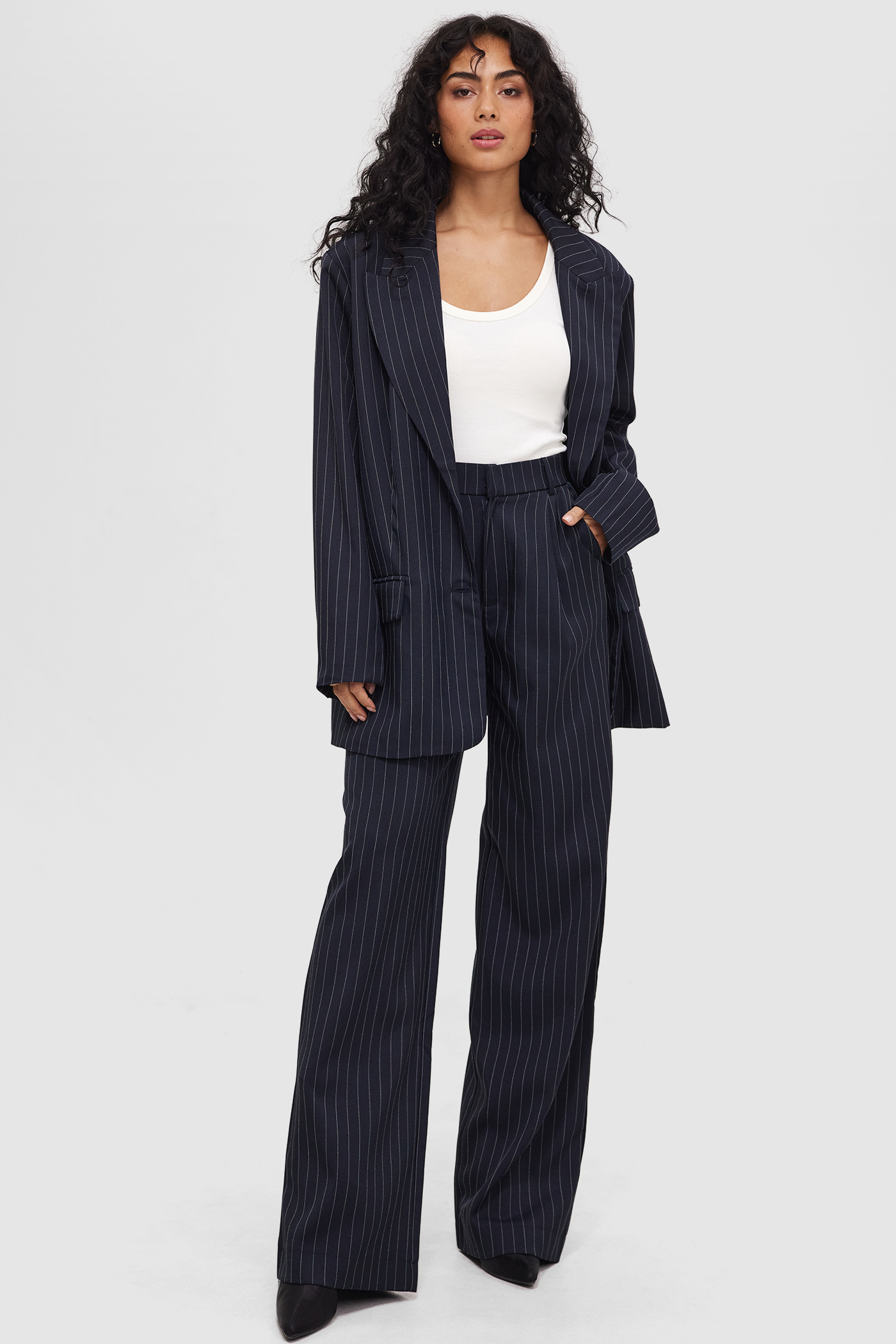 Blauwe pantalon met krijtstreep EUR 49,99Deze pantalon heeft een krijtstreep motief, een rits- en haaksluiting, zakken aan de voorkant en wijde broekspijpen.