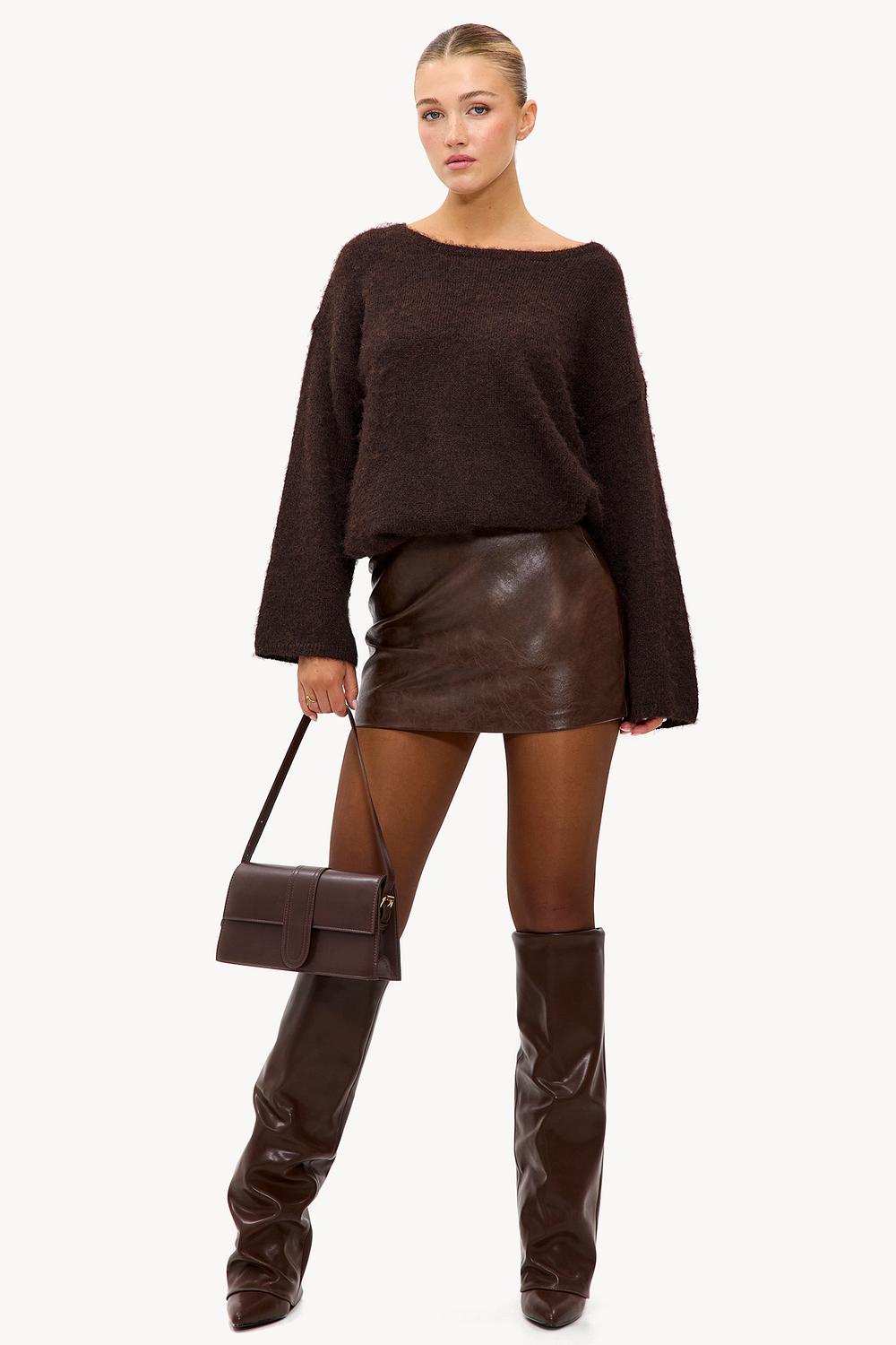 Deze donkerbruine leather-look mini skirt heeft een luxe PU finish voor een statement look. De korte pasvorm met hoge taille creëert een moderne shape die perfect aansluit. De chocoladebruine kleur geeft deze rok een chique twist. Style deze mini skirt met een turtleneck top voor een iconic dinner date look.