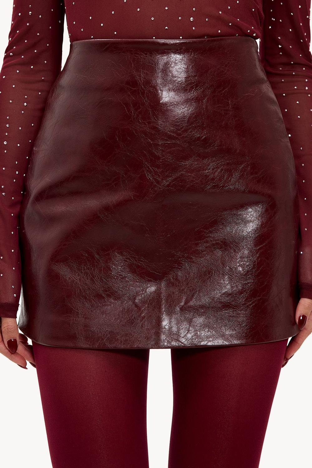 Deze bordeaux leather-look mini skirt heeft een luxe high-waisted fit die perfect de shape accentueert. Het glanzende PU materiaal geeft een edgy twist aan je outfit en zorgt voor een statement look. De strakke pasvorm creëert een chique uitstraling die ideaal is voor een girls night out. Style deze rok met een crop top en hoge laarzen voor een complete bordeaux look.