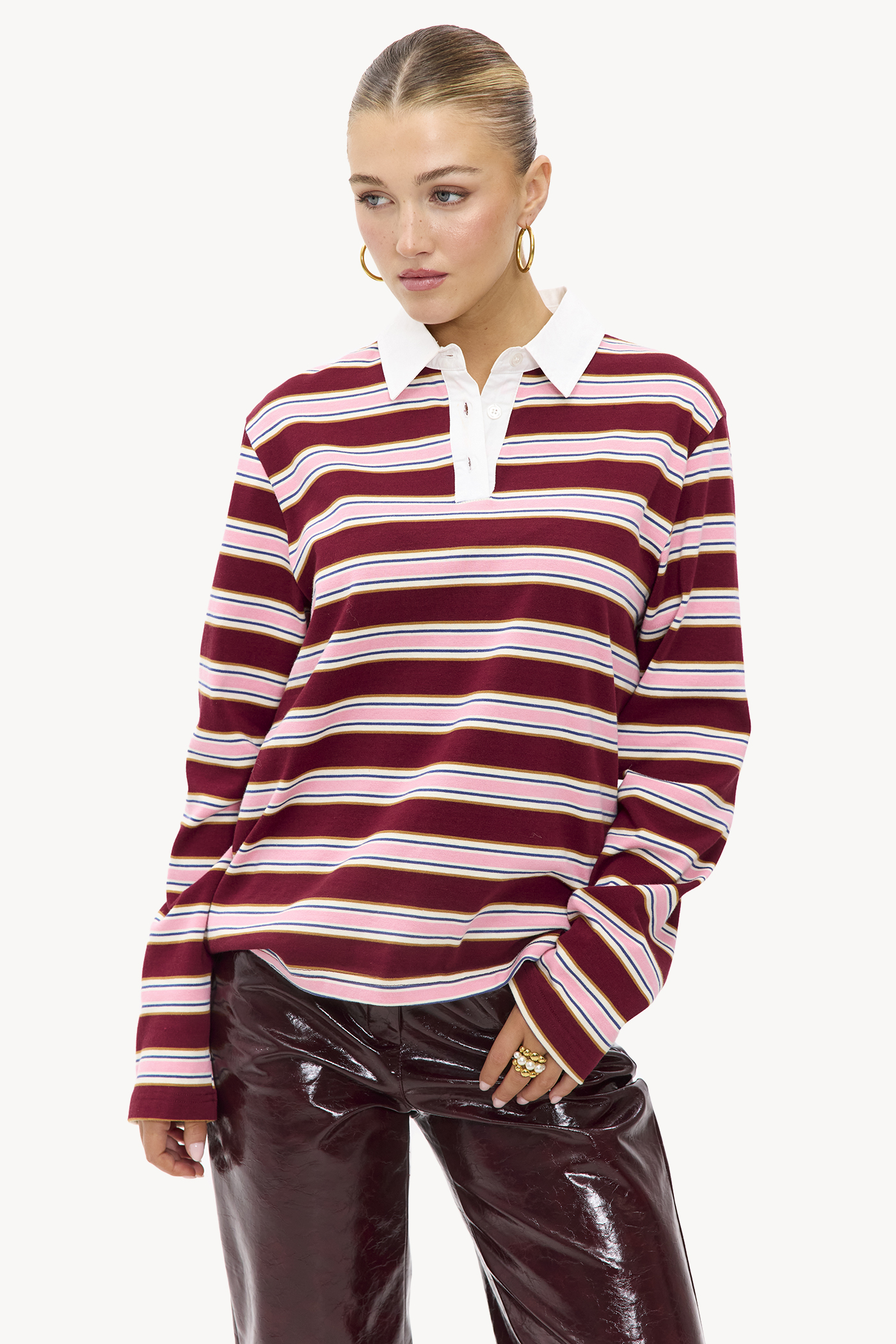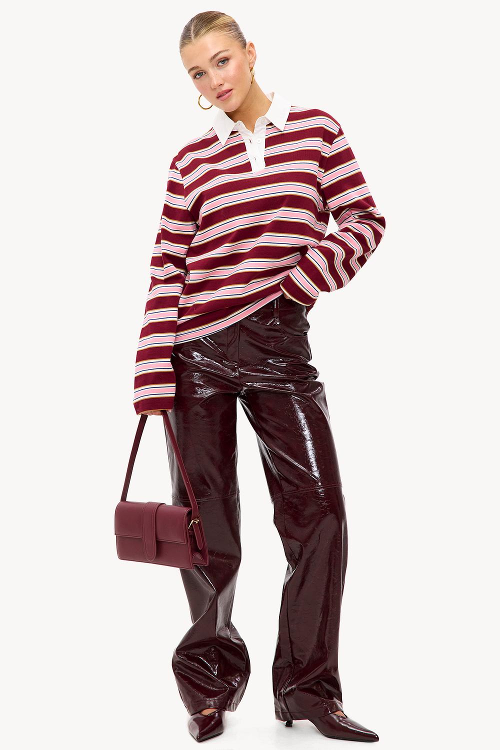 Deze gestreepte polo longsleeve heeft een klassiek rugby design met bordeaux en roze strepen. De witte kraag met knoopsluiting en oversized fit geven deze top een retro sporty vibe. De 100% katoenen kwaliteit zorgt voor comfort en een premium feel. Style deze polo met een leather-look short voor een coole casual look.