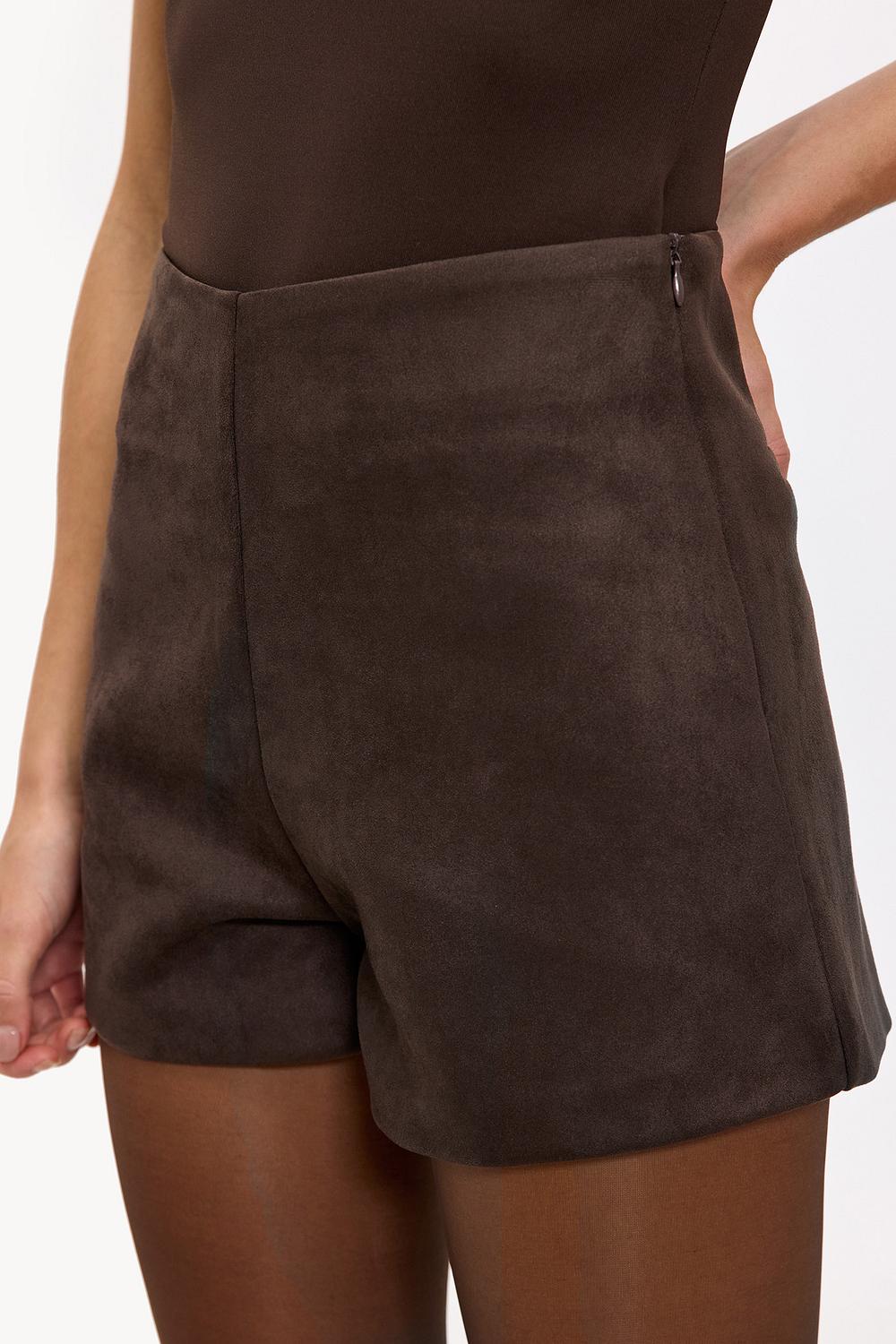 Deze bruine short heeft een suede-like textuur voor een sophisticated look. De tailored fit met high-waisted design en clean lijnen creëert een chique uitstraling. De polyester blend zorgt voor comfort en een mooie vorm. Style deze short met de bijpassende blazer voor een stunning co-ord look.
