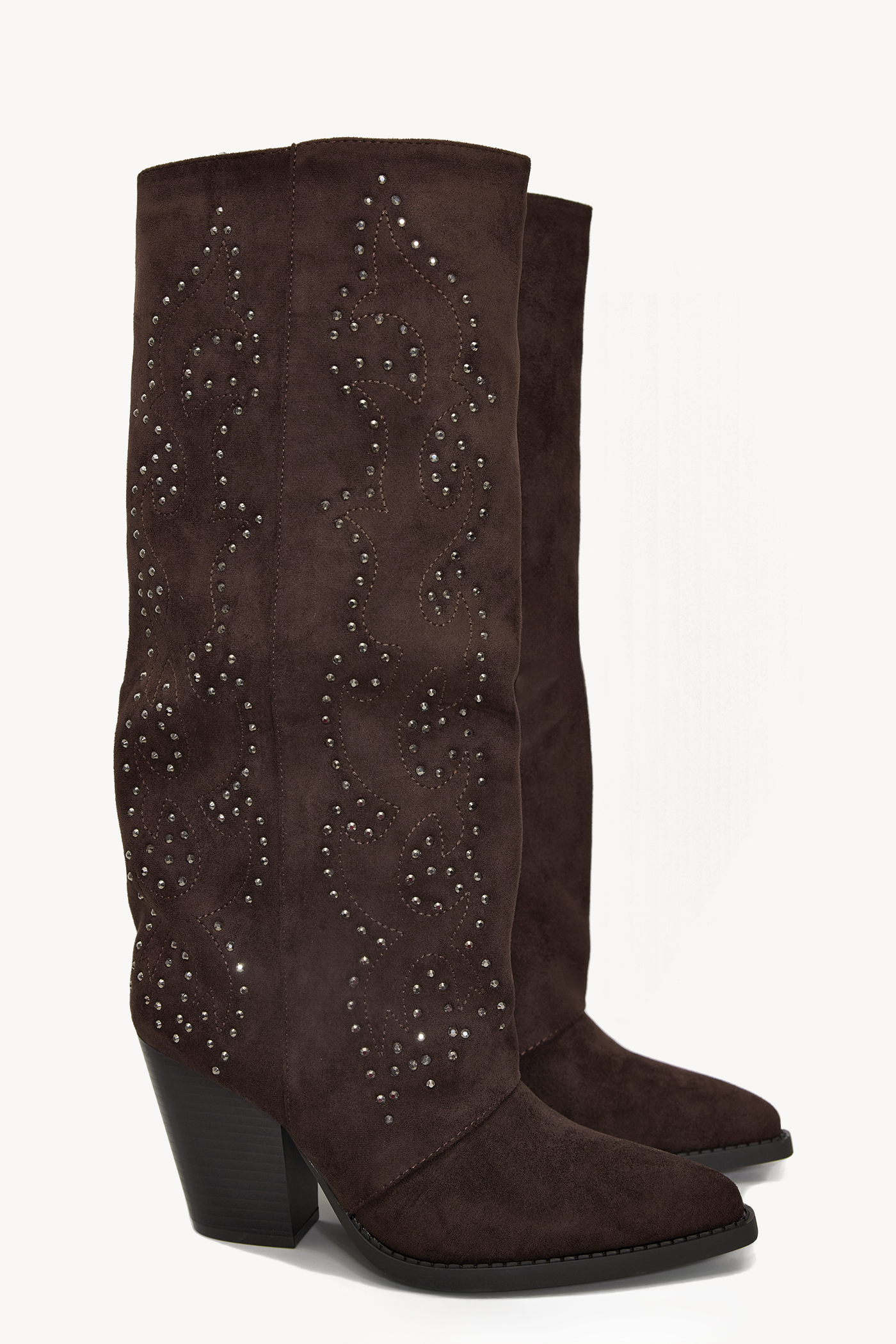 Bruine suéde-look laarzen met zilveren studs EUR 65,99Deze donkerbruine cowboy boots hebben opvallende studs all over in een paisley patroon voor een western-inspired look. De suede-like finish met puntige neus en blokhak creëert een statement uitstraling. De hoge schacht met decoratieve stud details geeft deze boots een edgy twist. Style ze met een denim mini skirt en oversized blazer voor een coole festival look.