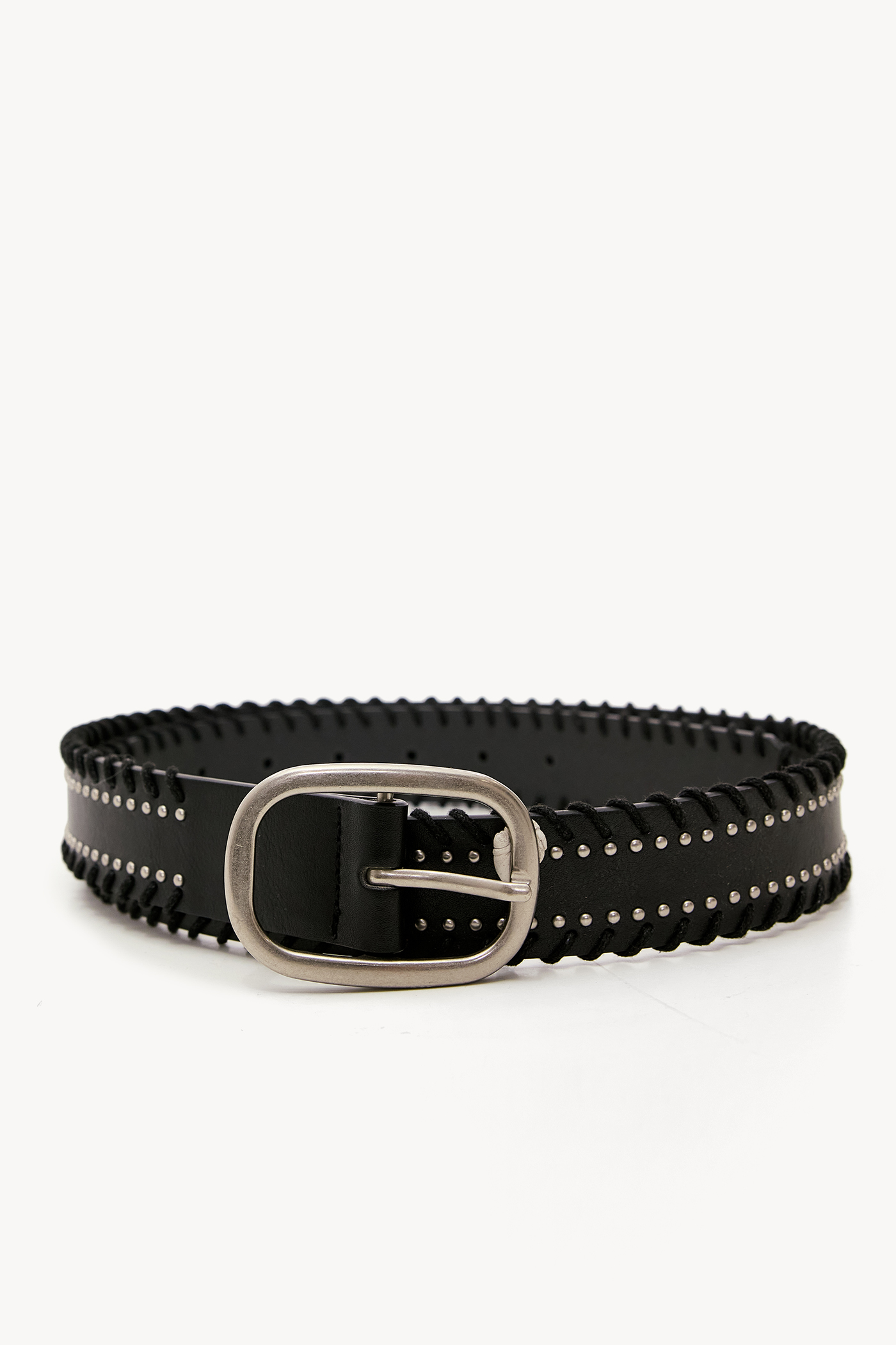 Deze zwarte riem heeft opvallende studs all over en statement scalloped randen voor een edgy look. De ovale zilveren gesp en dubbele rij studs geven deze accessoire een rock-chic uitstraling. De vegan leather kwaliteit zorgt voor duurzaamheid en comfort. Style deze statement riem met een oversized blazer en wide leg jeans voor een coole twist aan je outfit.