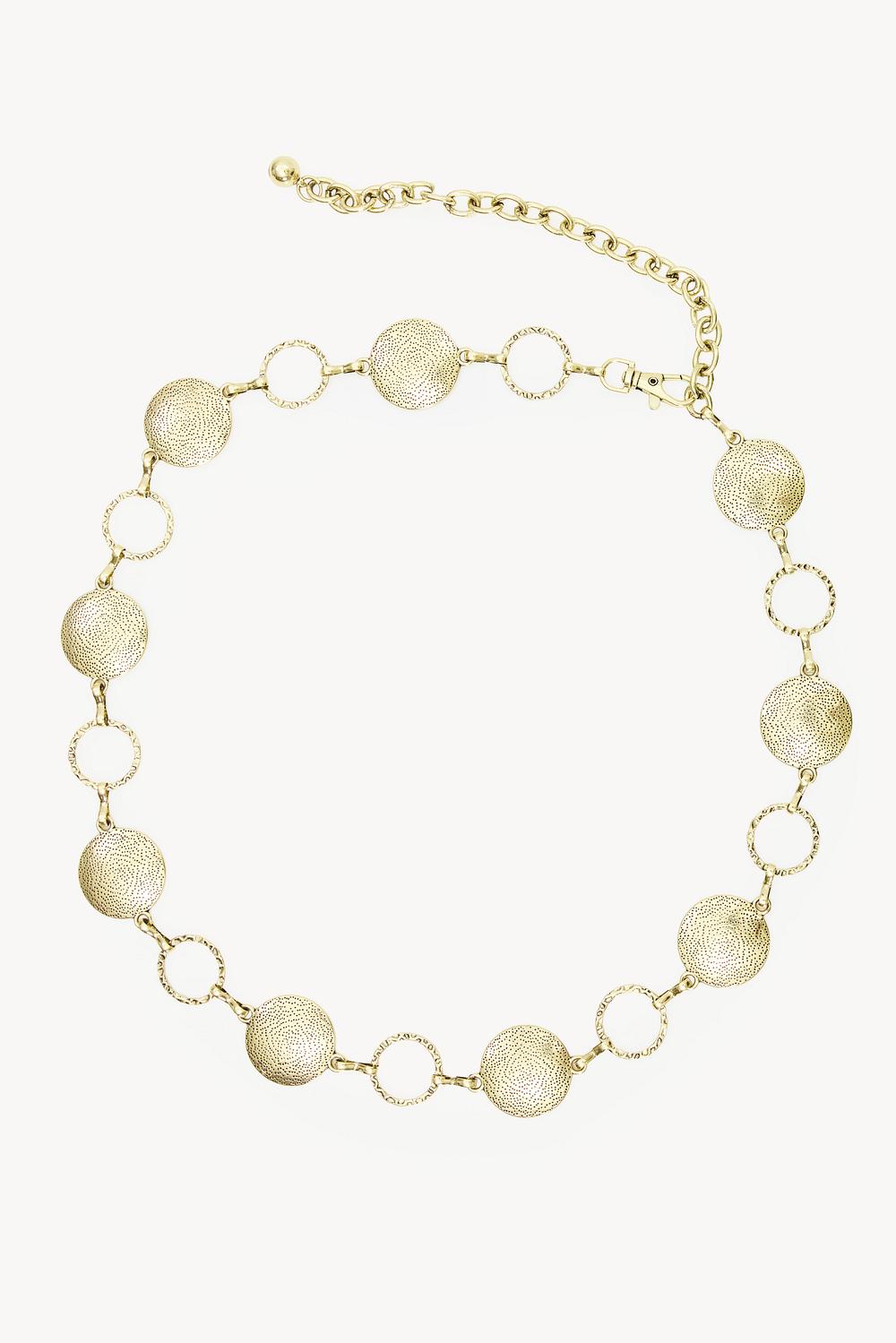 Deze gouden chain belt heeft een opvallend design met afwisselende ronde en open schakels. De metalen ketting met textured details creëert een luxe statement look. Perfect om je taille te accentueren en een chique twist te geven aan je outfit. Style deze belt over een oversized blouse of jurk voor een moderne silhouette.