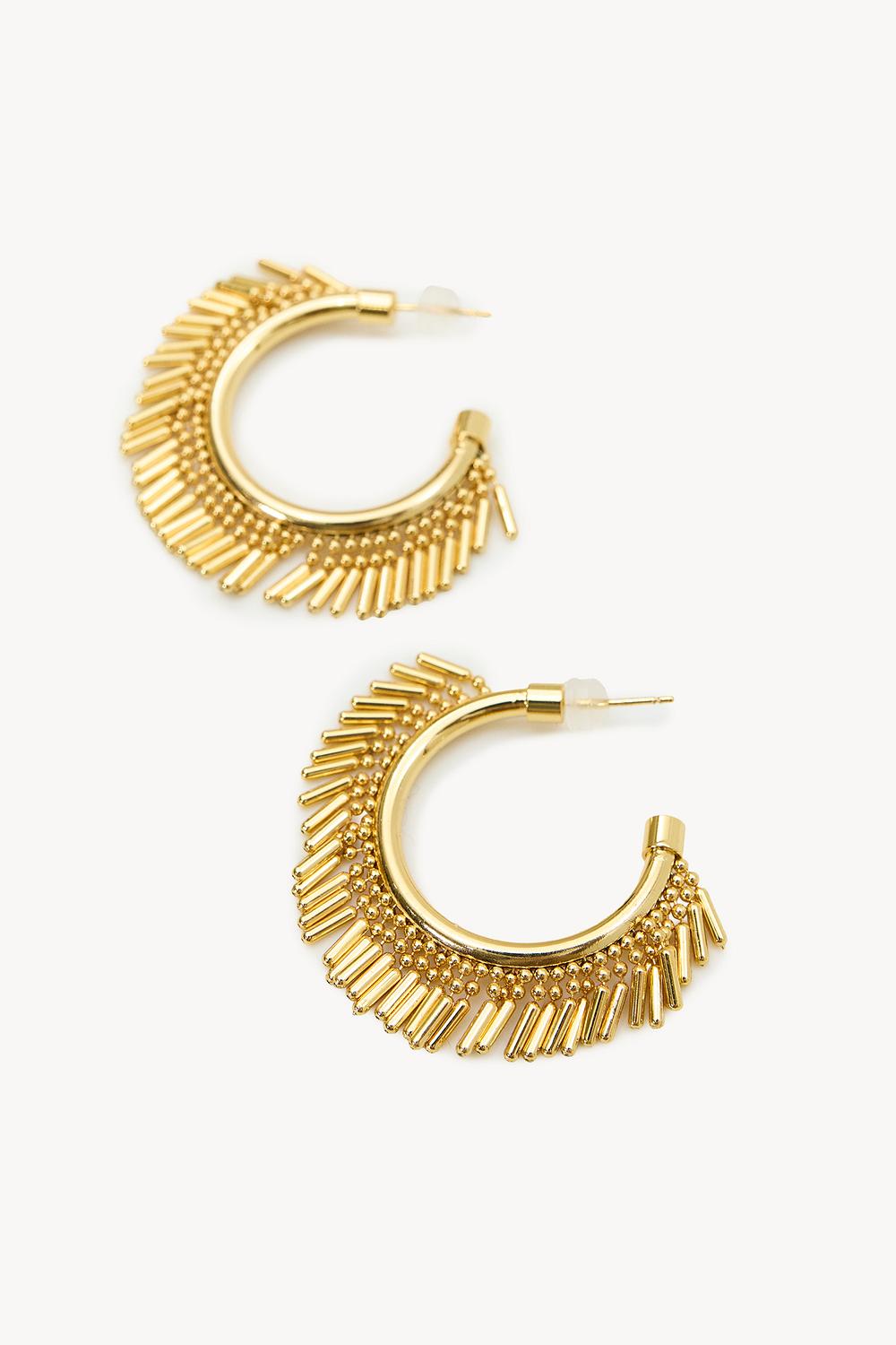 Deze gouden hoops hebben een opvallend textured design met statement fringes all over. De hoop earrings zijn gemaakt van hoogwaardig stainless steel met goudplating voor een luxe finish. De moderne franje details geven deze oorbellen een edgy twist die perfect past bij zowel casual als chique outfits.