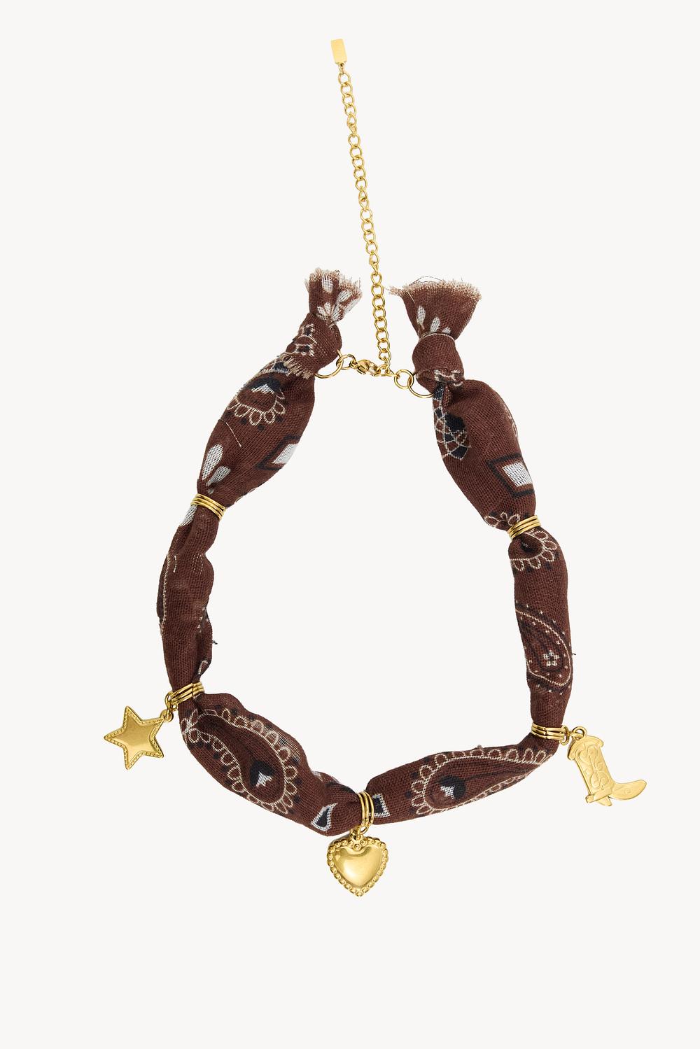 Deze bruine paisley ketting heeft een opvallend bandana design met gouden statement charms. De 100% stainless steel goldplated basis zorgt voor duurzaamheid en een luxe uitstraling. De speelse combinatie van ster-, hart- en cowboy boot hangers geeft deze choker een boho-chic vibe. Perfect om je casual outfits een instant upgrade te geven.