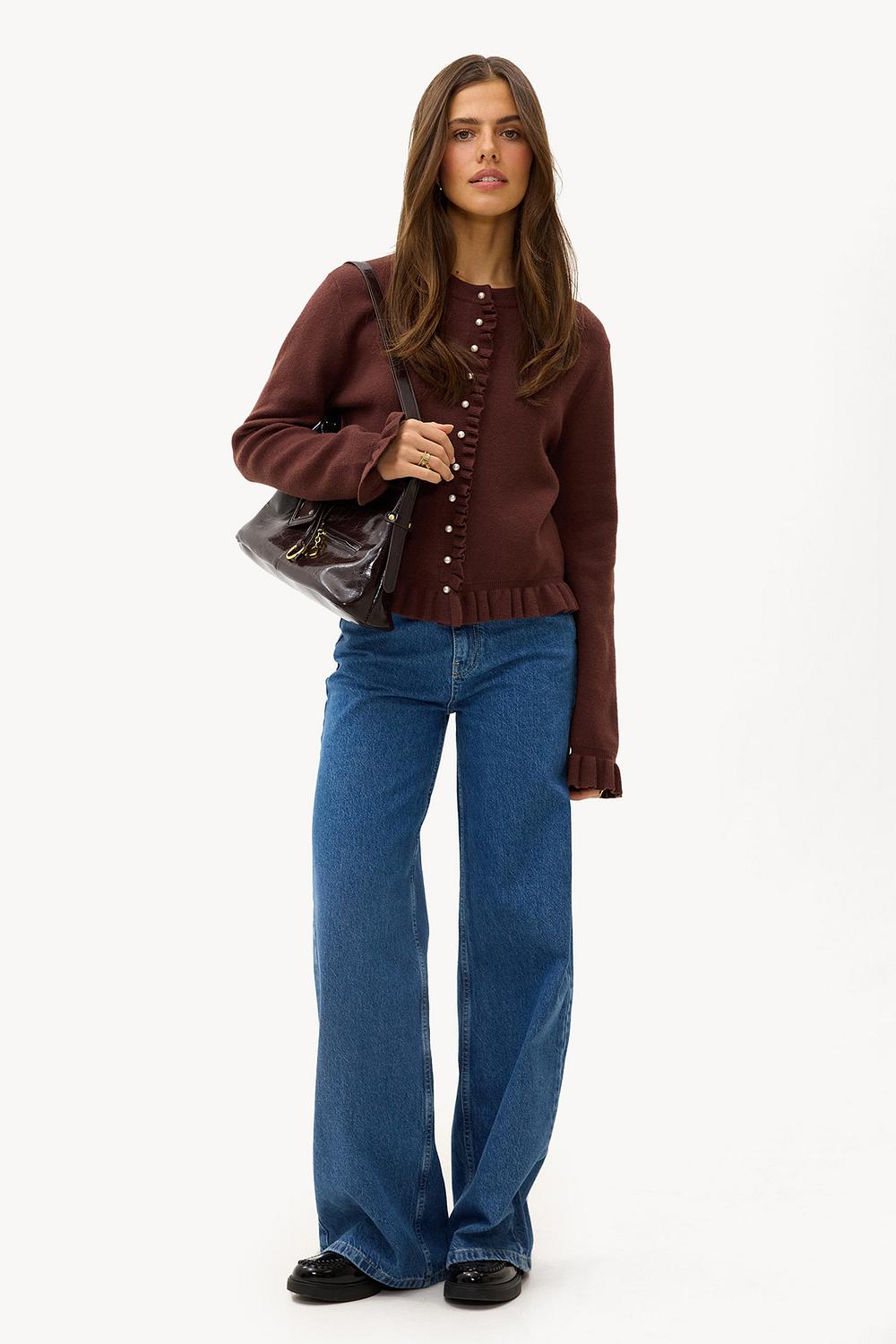 Bruin vest met parel knopen EUR 39,99Deze bruine cardigan heeft een statement knopenrij met parel details en romantische ruffle accenten. De zachte viscose blend zorgt voor comfort en een luxe uitstraling. De ribbed boorden en tailored fit geven deze knit een chique twist. Style deze cardigan met wide leg jeans voor een casual chique look.