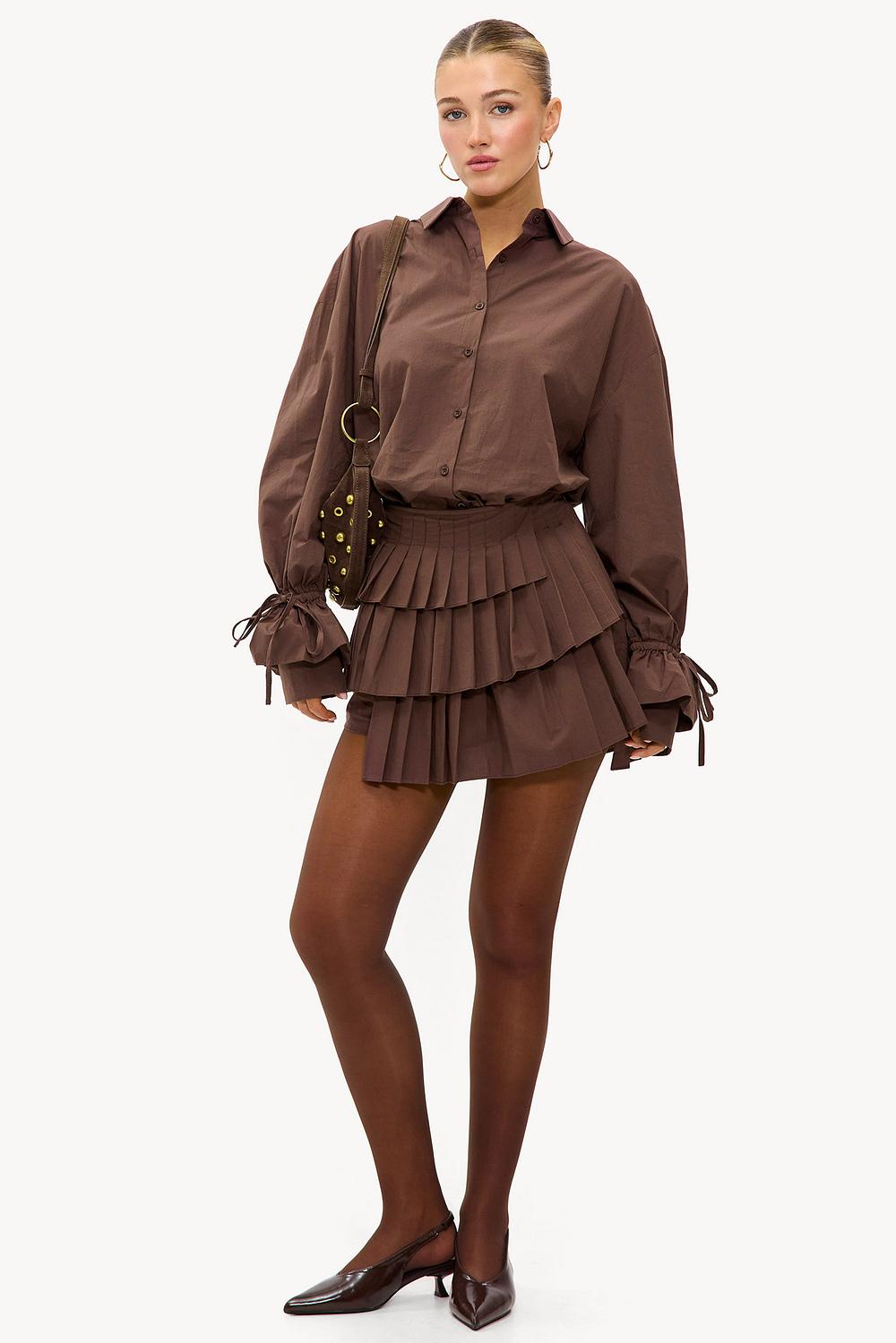 Bruine skort EUR 45,99Deze bruine skort heeft opvallende gelaagde ruffle details voor een statement look. De korte rok met geïntegreerde short combineert comfort met een dramatic design door de cascading plissé lagen. De asymmetrische ruffle details geven deze skort een moderne twist. Style deze skort met de bijpassende blouse voor een stunning co-ord look tijdens een dinner date.