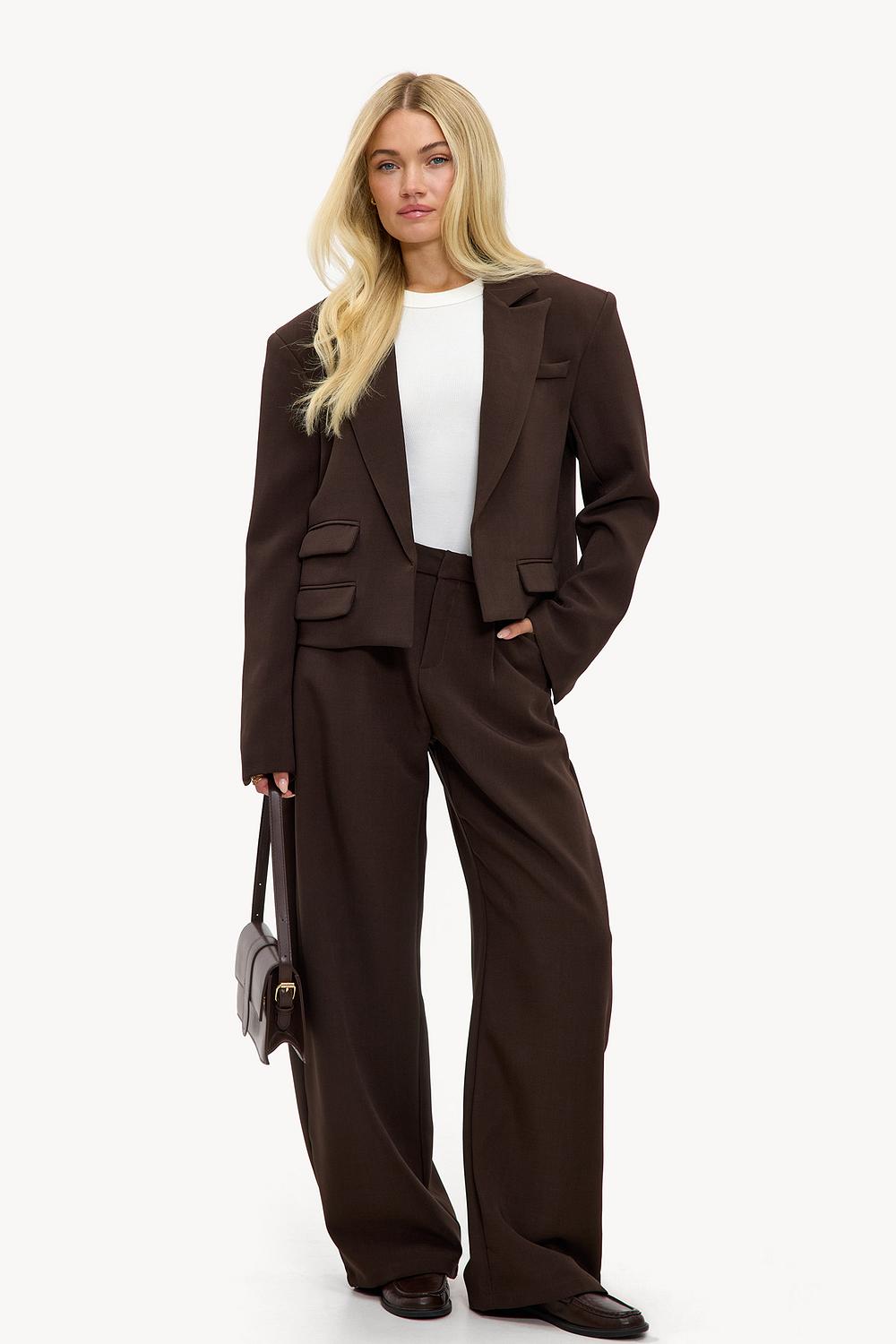 Bruine blazer EUR 69,99Deze donkerbruine blazer heeft een tailored fit met statement pockets aan de voorzijde. De klassieke revers en knoopsluiting geven dit design een chique twist. De oversized pasvorm creëert een moderne look. Style deze blazer met de bijpassende wide leg broek voor een sophisticated co-ord look.