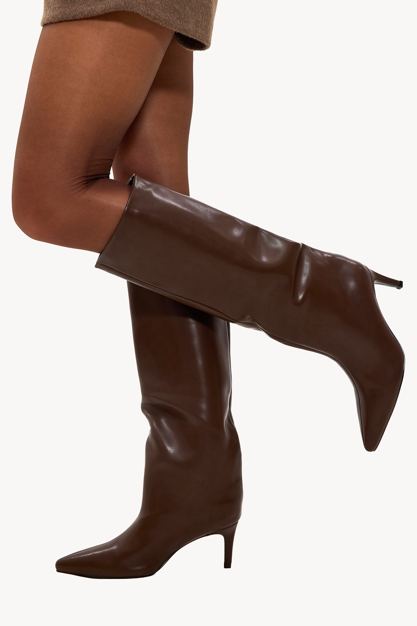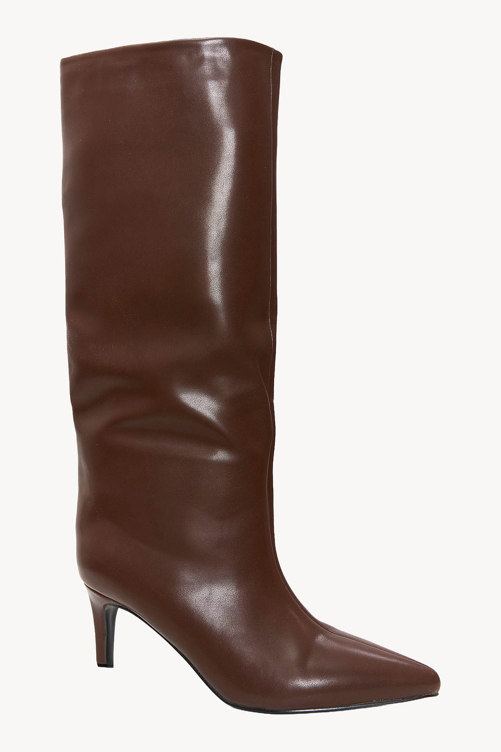 Deze bruine knee-high boots hebben een luxe leather-look finish met een pointed toe design. De elegante kitten heel en strakke fit creëren een sophisticated look die perfect is voor office days of dinner dates. De hoge schacht met subtiele details geeft deze boots een moderne twist.