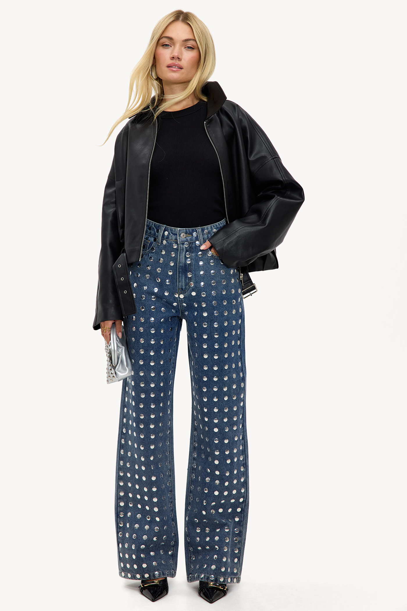 Deze blauwe wide leg jeans heeft opvallende studs all over voor een statement look. De high-waisted fit met wijde pijpen creëert een moderne twist op het klassieke denim design. De katoenen blend zorgt voor comfort en een luxe uitstraling. Style deze jeans met een zwarte crop top en leather jacket voor een coole casual look.