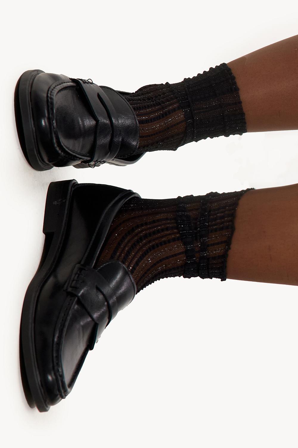 Zwarte sokken met gouden glitters EUR 9,99Deze zwarte sokken hebben een opvallend transparant streepdesign voor een statement look. De subtiele sheer details geven een moderne twist aan het klassieke sokken design. Style deze sokken met loafers voor een chique casual uitstraling.
