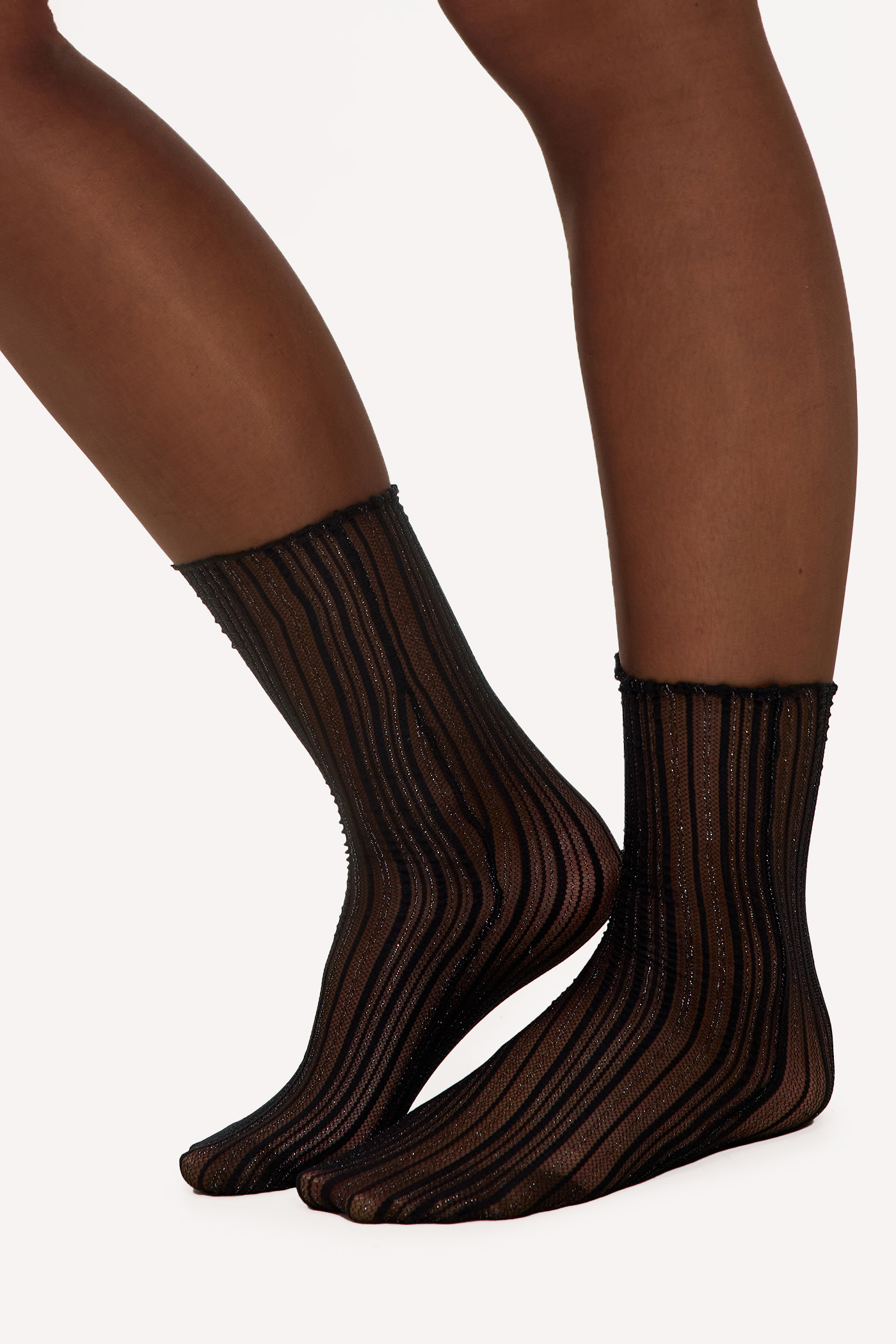 Zwarte sokken met gouden glitters EUR 9,99Deze zwarte sokken hebben een opvallend transparant streepdesign voor een statement look. De subtiele sheer details geven een moderne twist aan het klassieke sokken design. Style deze sokken met loafers voor een chique casual uitstraling.