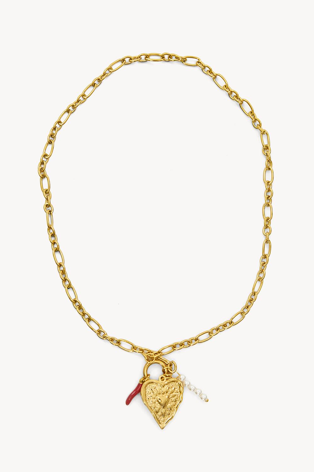 Deze gouden chain ketting heeft een statement heart pendant met textured details en rode accent hanger. De chunky chain met pearl details creëert een luxe look. De 100% stainless steel goldplated kwaliteit zorgt voor duurzaamheid en een high-end uitstraling. Style deze ketting met een zwarte blouse voor een chique contrast.