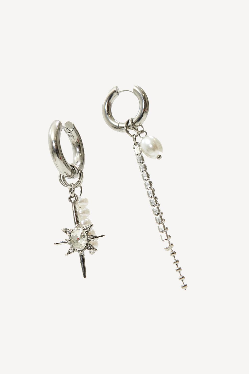 Deze zilveren oorbellen hebben een asymmetrisch design met statement hangers. De ene oorbel heeft een ster met spikes en parel detail, terwijl de andere een lange ketting met parel accent heeft. De hoogwaardige stainless steel kwaliteit zorgt voor duurzaamheid en een luxe afwerking. Style deze statement earrings met een sleek updo om de asymmetrische details optimaal te laten uitkomen.