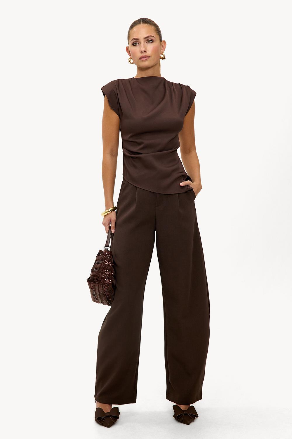Donkerbruine top EUR 29,99Deze bruine top heeft statement shoulder pads en een mock neck voor een power dressing look. De mouwloze pasvorm met subtiele plooien aan de zijkant accentueert de shape op een chique manier. De stretch kwaliteit zorgt voor optimaal draagcomfort. Style deze top met de matching wide leg broek voor een complete co-ord look.