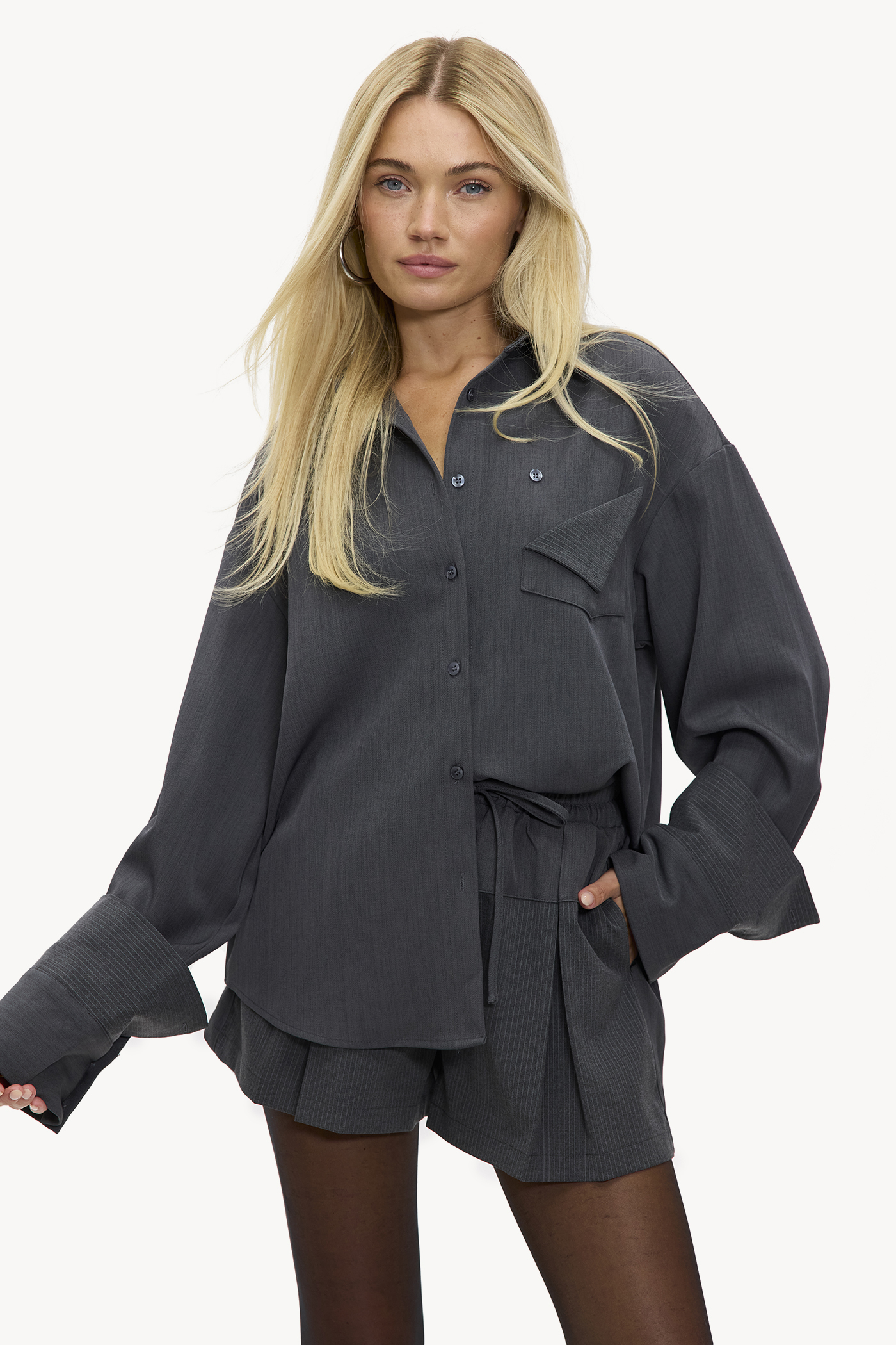 Donkergrijze blouse EUR 49,99Deze donkergrijze oversized blouse heeft een utility-inspired design met statement borstzakken en knoopdetails. De losse fit met lange mouwen en klassieke kraag creëert een cool casual look. De versatile pasvorm maakt deze blouse perfect voor verschillende styling opties. Style deze blouse met een mini skirt en hoge laarzen voor een chique casual outfit.