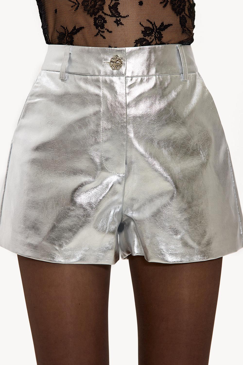Deze zilveren leather-look short heeft een high-waisted fit met statement metallic finish. De tailored pasvorm met decoratieve knoop sluiting creëert een luxe uitstraling. De korte lengte en glanzende texture zorgen voor een edgy party look. Style deze short met een zwarte transparante top voor een stunning night out outfit.