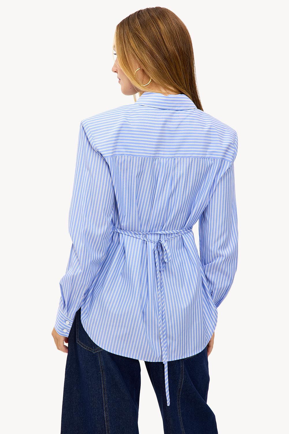 Blauwe blouse met strepen EUR 49,99Deze blauwe gestreepte blouse heeft een klassieke button-down stijl met een oversized fit. De verticale pinstripes en witte knoopsluiting geven een tijdloze office-ready uitstraling. De lange mouwen en afgeronde zoom zorgen voor een moderne twist op het traditionele shirt design. Style deze blouse met wide leg jeans voor een chique casual look.