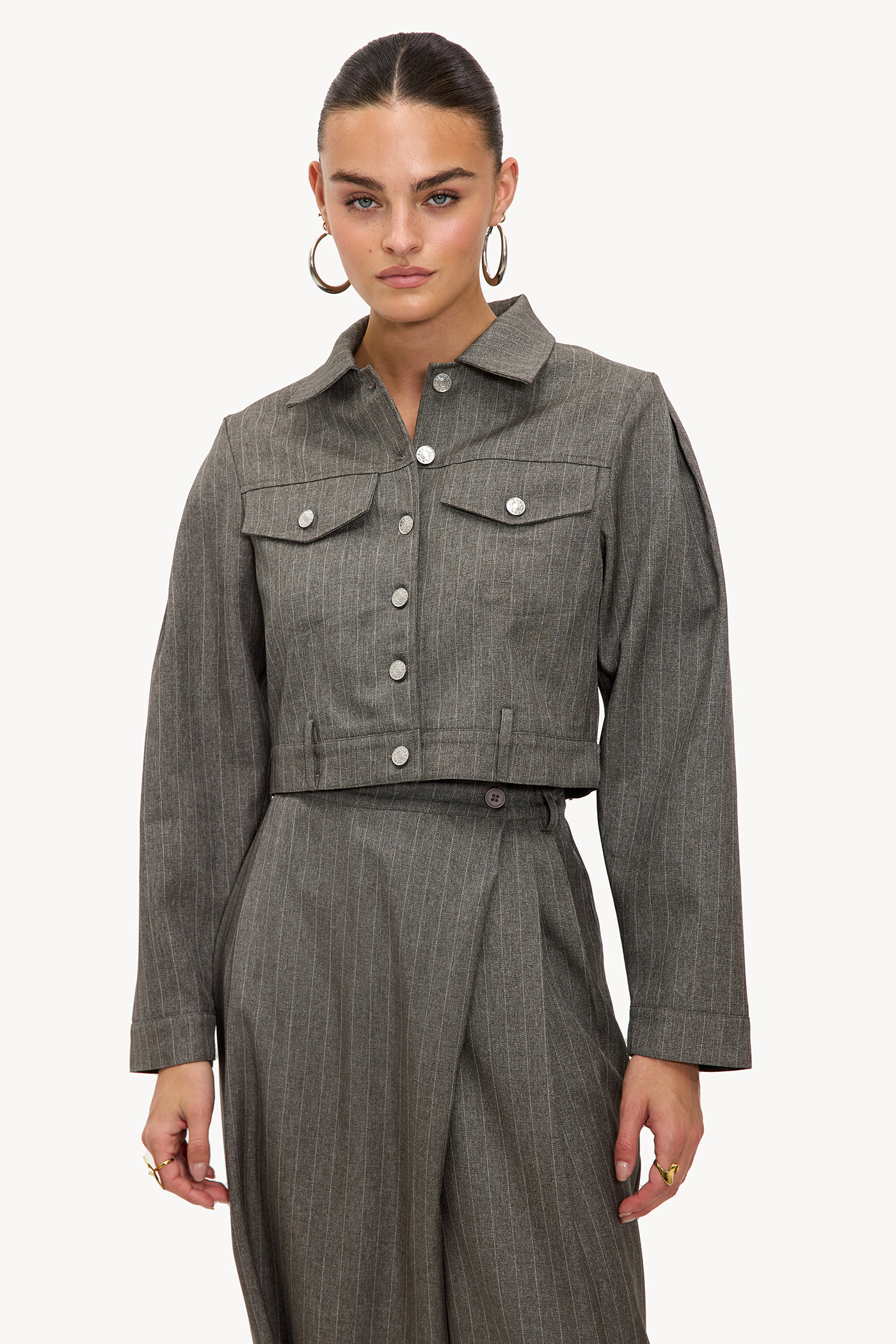 Deze grijze cropped jacket heeft een utility-inspired design met klassieke borstzakken en zilveren drukknopen. De tailored fit met ceintuur accentueert de shape voor een chique look. De pinstripe textuur geeft deze jacket een moderne twist. Style deze jacket met de bijpassende wide leg broek voor een stunning co-ord look.