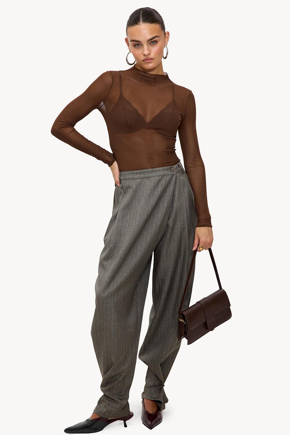 Grijze broek EUR 59,99Deze grijze wide leg broek heeft een klassieke pinstripe print voor een tailored look. De high-waisted fit met decoratieve knoop en plooien aan de voorzijde creëert een sophisticated shape. De relaxed pasvorm met smalle enkels geeft deze broek een updated twist op het tijdloze design.