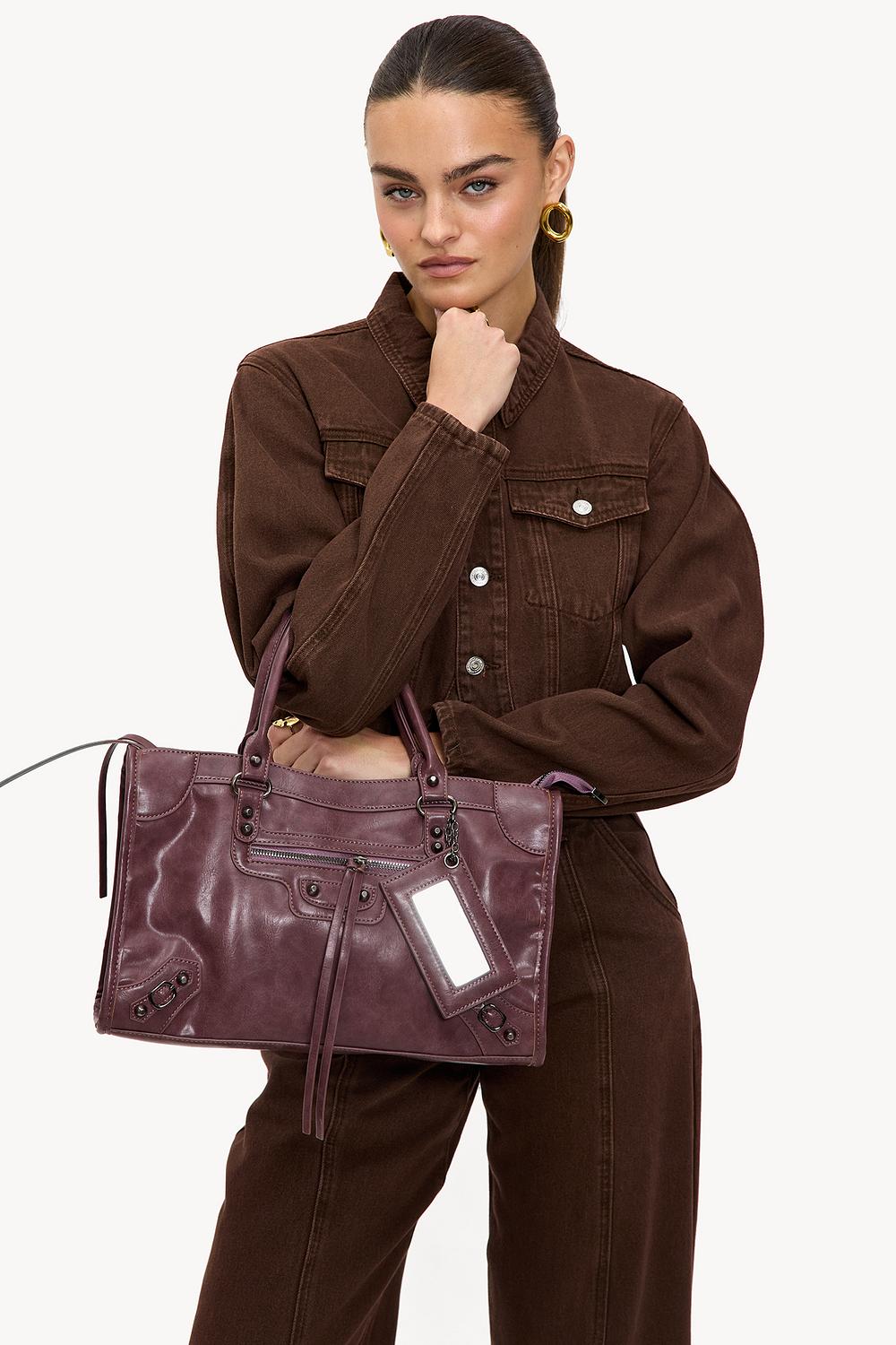 Deze donkerrode tote bag heeft een edgy leather look design met decoratieve hardware details. De ruime tas met dubbele hengsels en praktische ritsvakken biedt veel ruimte voor je daily essentials. Het vegan leather materiaal zorgt voor een luxe uitstraling met een rock-chic twist. Style deze statement bag met een oversized blazer voor een coole casual look.