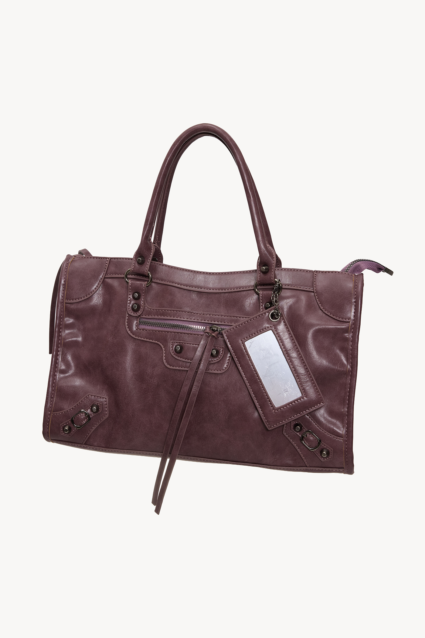 Deze donkerrode tote bag heeft een edgy leather look design met decoratieve hardware details. De ruime tas met dubbele hengsels en praktische ritsvakken biedt veel ruimte voor je daily essentials. Het vegan leather materiaal zorgt voor een luxe uitstraling met een rock-chic twist. Style deze statement bag met een oversized blazer voor een coole casual look.
