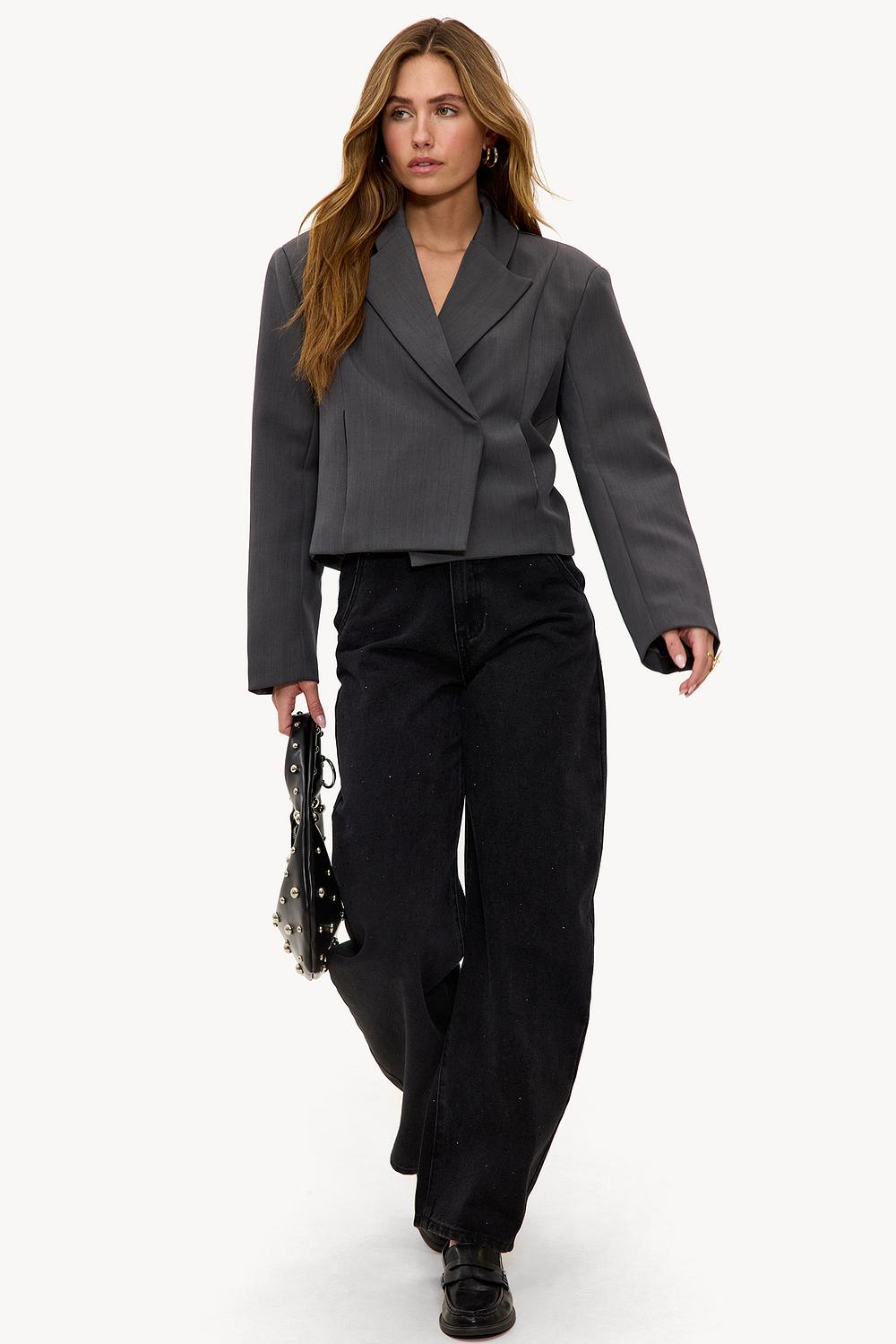 Deze donkergrijze blazer heeft een oversized fit met statement brede revers voor een moderne twist. De cropped pasvorm met dubbele knoopsluiting creëert een chique look die perfect aansluit bij de huidige trends. De zachte polyester blend zorgt voor comfort en een luxe uitstraling. Style deze blazer met wide leg jeans voor een on point office-to-evening look.