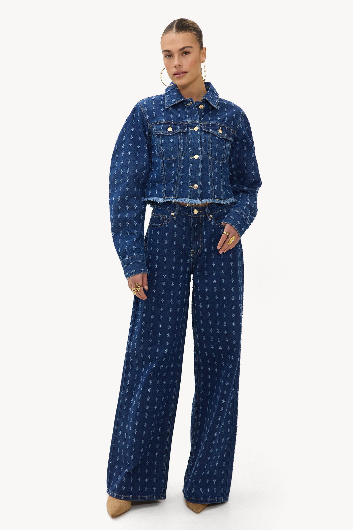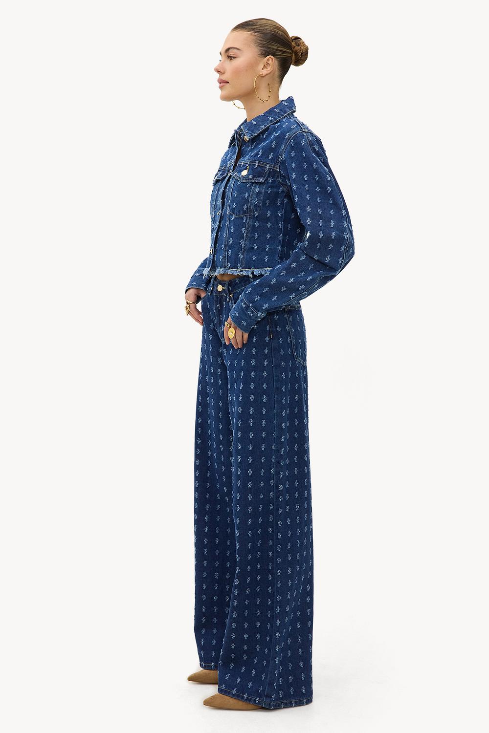 Deze blauwe wide leg jeans heeft een opvallende all-over print met kleine details voor een statement look. De high-waisted fit met wijde pijpen creëert een moderne twist op klassiek denim. De 5-pocket styling met contrasterende stiksels houdt het design authentiek en cool.