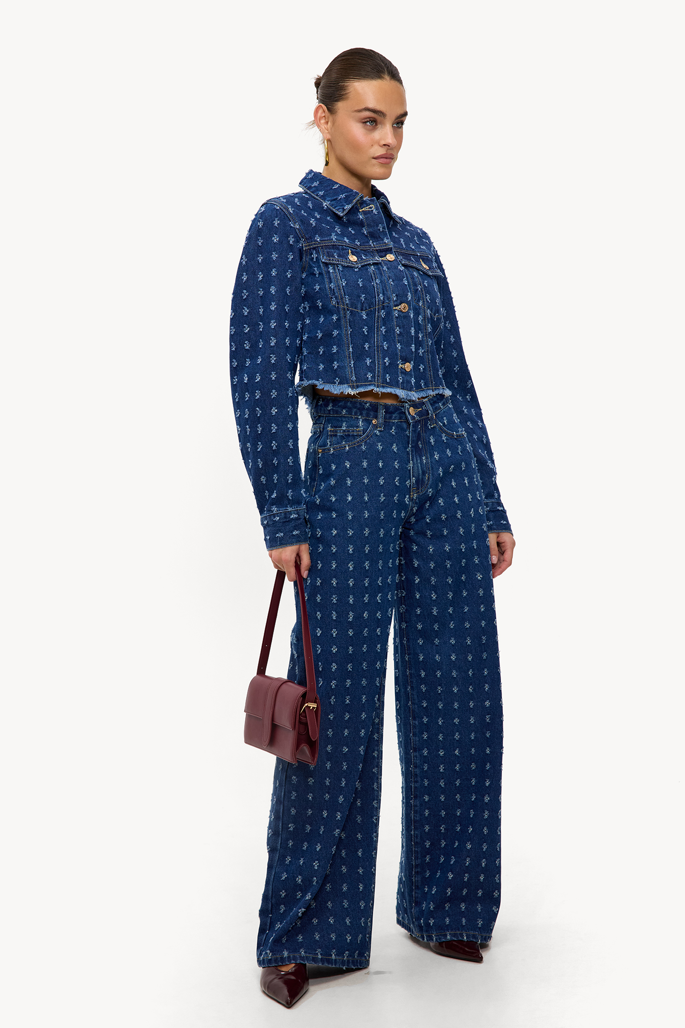 Deze 5-pocket wide leg jeans heeft een opvallende all over print met subtiele distressed details op een diepe denim base. De high-waisted fit met wijde pijpen creëert een statement look met vintage vibes. De zachte katoenen kwaliteit zorgt voor comfort en een luxe denim feel. Style deze jeans met de bijpassende denim jacket voor een complete co-ord look.