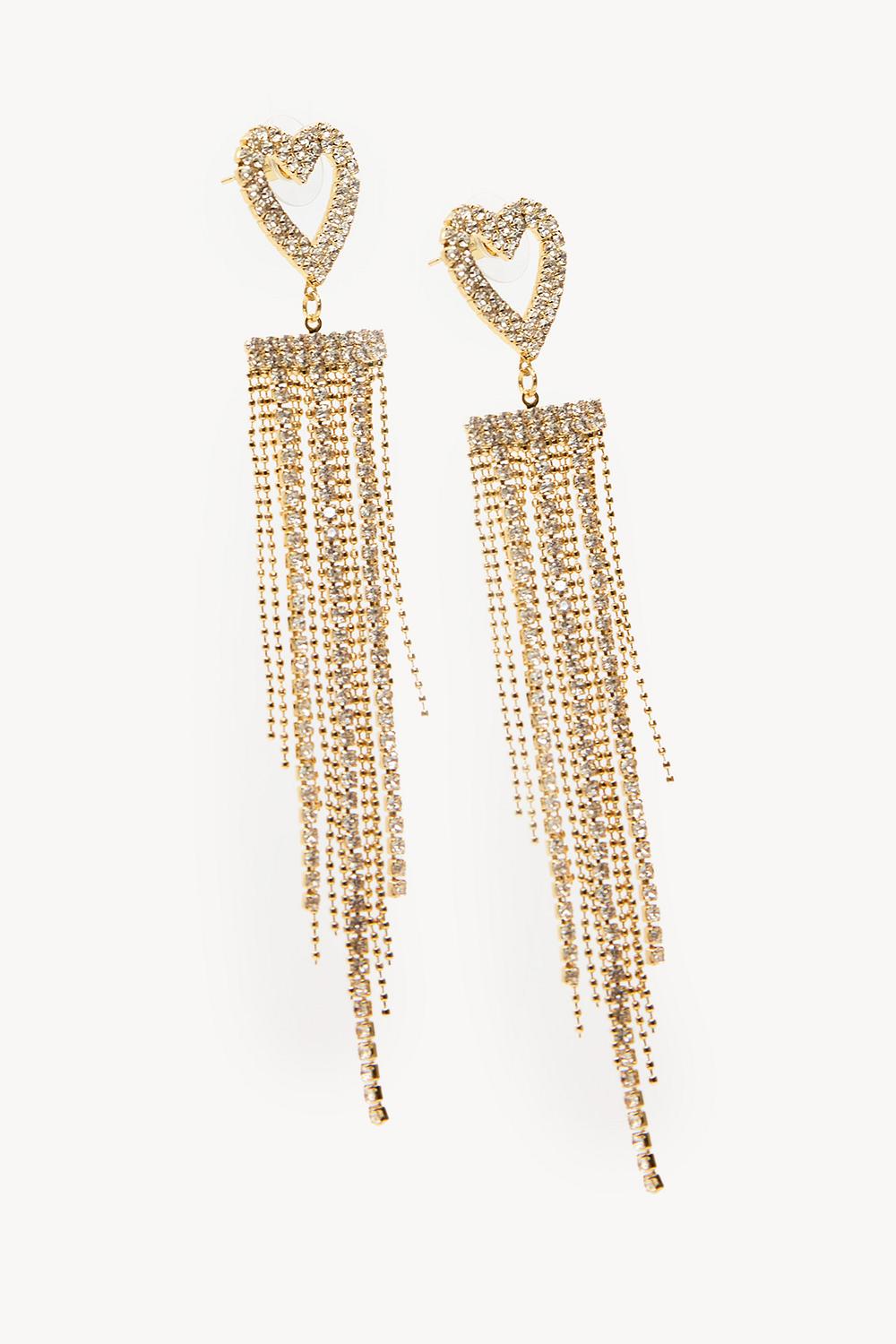 Gouden oorbellen met hart en strass stenen EUR 17,99Deze gouden statement oorbellen hebben een romantisch hart design met chain fringes. De textured hart studs met lange bewegende kettinkjes creëren een dramatic look. Deze oorbellen zijn perfect voor een girls night out of dinner date.