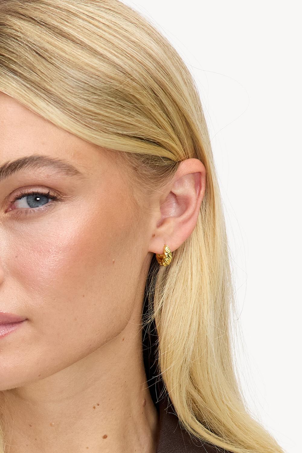 Deze gouden hoop earrings hebben een opvallend twisted design voor een statement look. De chunky vorm met gedraaide textuur creëert een luxe uitstraling. De hoogwaardige stainless steel goldplated afwerking zorgt voor duurzaamheid en een perfect gouden shine. Style deze earrings met een sleek updo om de focus op deze statement accessoires te leggen.