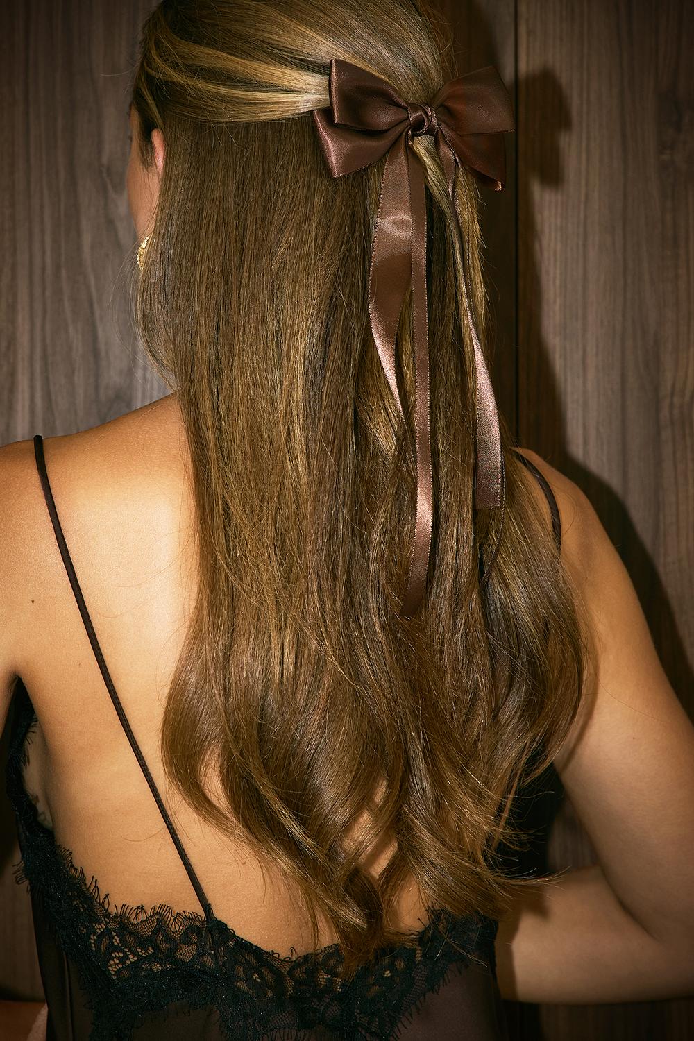 Deze bruine satin-like hair bow heeft lange linten die perfect zijn voor een romantic hairstyle. De donkerbruine kleur en luxe textuur geven direct een chique touch aan elke look. Bevestig de bow in je haar en laat de linten casual vallen voor een dreamy effect.