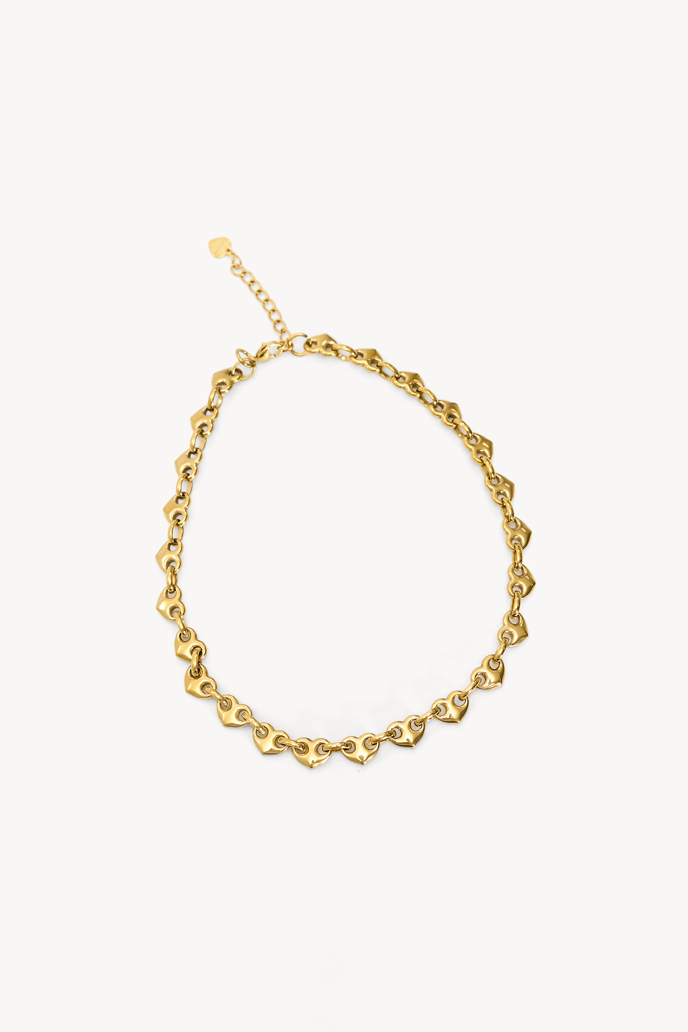 Deze gouden chain necklace heeft een opvallend twisted hart design voor een statement look. De chunky schakels van 100% stainless steel goldplated geven deze ketting een luxe uitstraling. De verstelbare sluiting zorgt voor een perfecte fit bij elke outfit. Style deze necklace met een transparante top voor een chique avondlook.