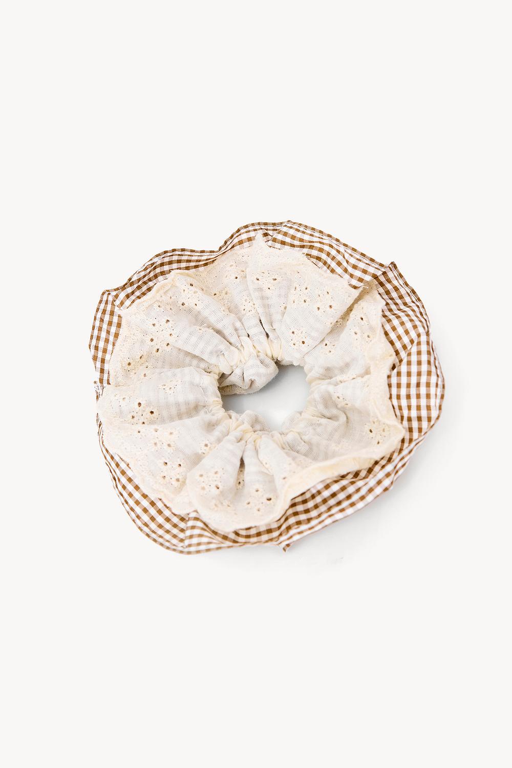 Deze bruine scrunchie heeft een gingham print met subtiele broderie anglaise details. Het katoenen design combineert een klassiek ruitjespatroon met witte accenten voor een romantische twist. De zachte textuur zorgt voor comfort en een goede grip zonder je haar te beschadigen. Perfect om je ponytail of bun een vintage inspired look te geven.
