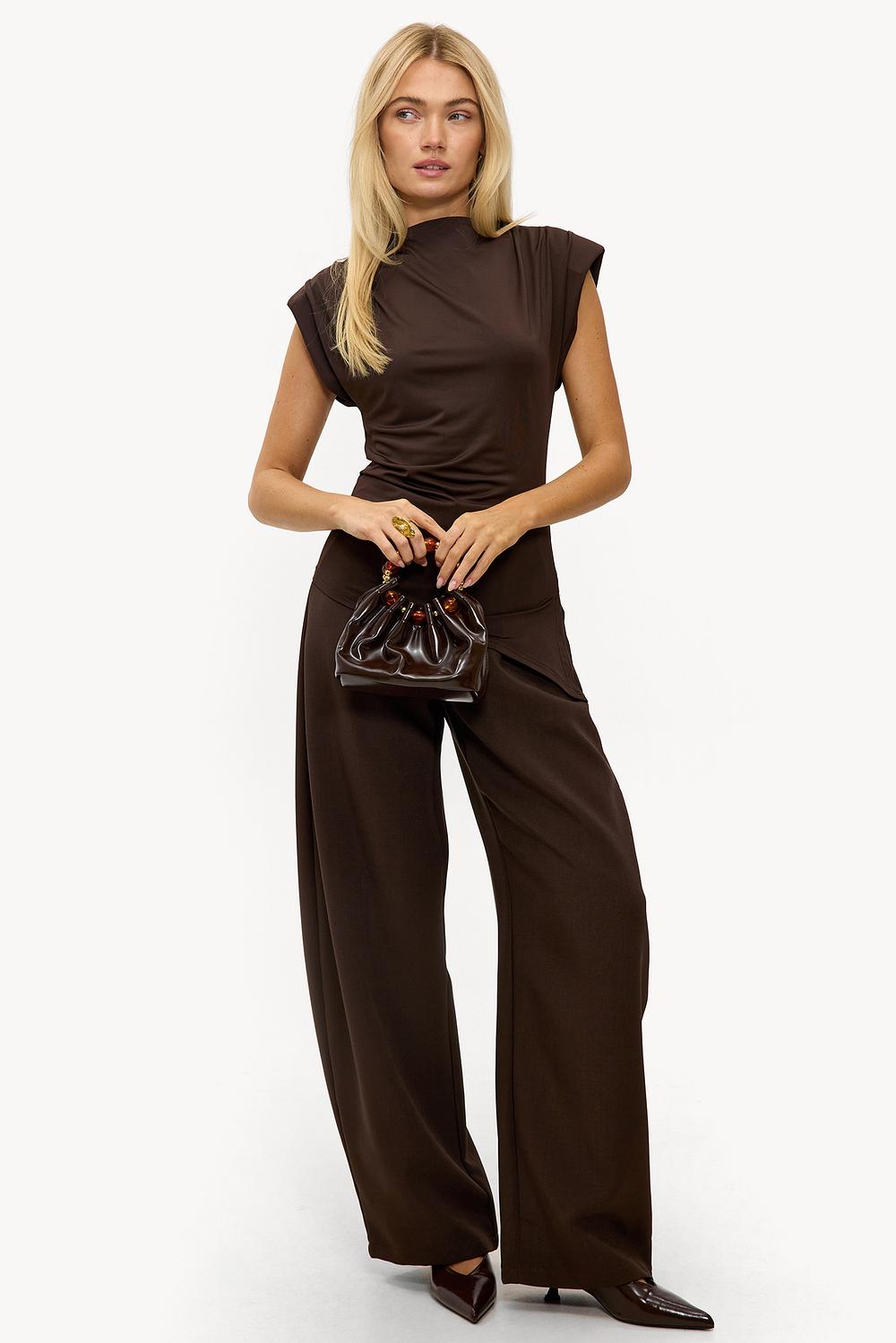 Donkerbruine top met schoudervulling EUR 29,99Deze donkerbruine top heeft een mock neck en statement shoulder pads voor een structured look. De korte mouwen en bodycon fit accentueren de shape op een moderne manier. De stretch kwaliteit zorgt voor comfort en een perfecte pasvorm. Style deze top met de bijpassende wide leg broek voor een chique co-ord look.
