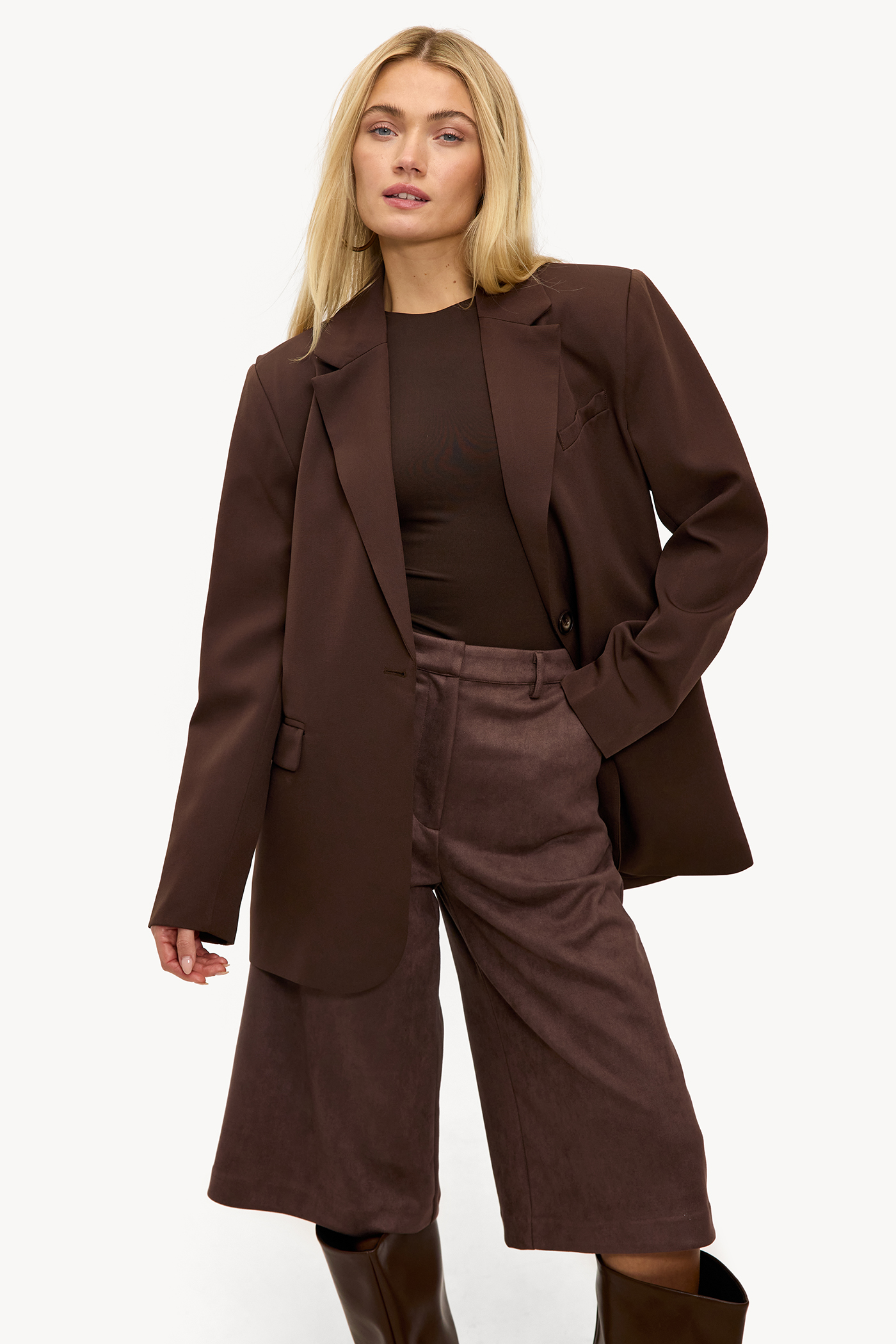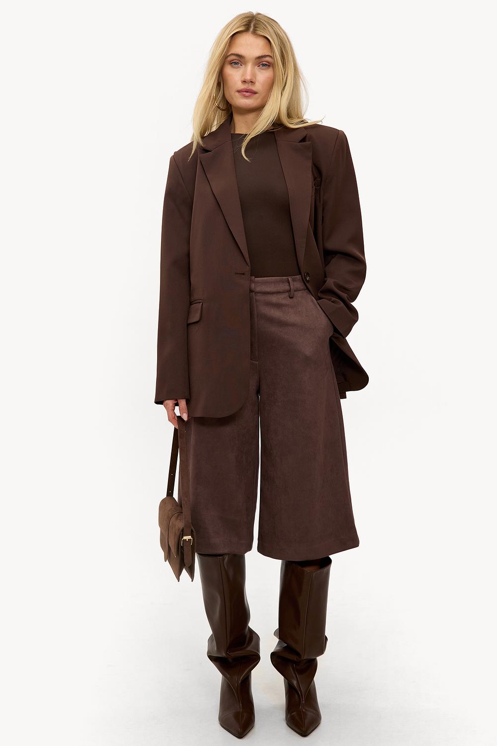 Deze donkerbruine culotte heeft een luxe suede-like textuur voor een sophisticated look. De wide leg fit met tailored details en steekzakken creëert een chique silhouet. De cropped lengte geeft deze broek een moderne twist. Style deze culotte met een fitted top en hoge laarzen voor een statement office look.