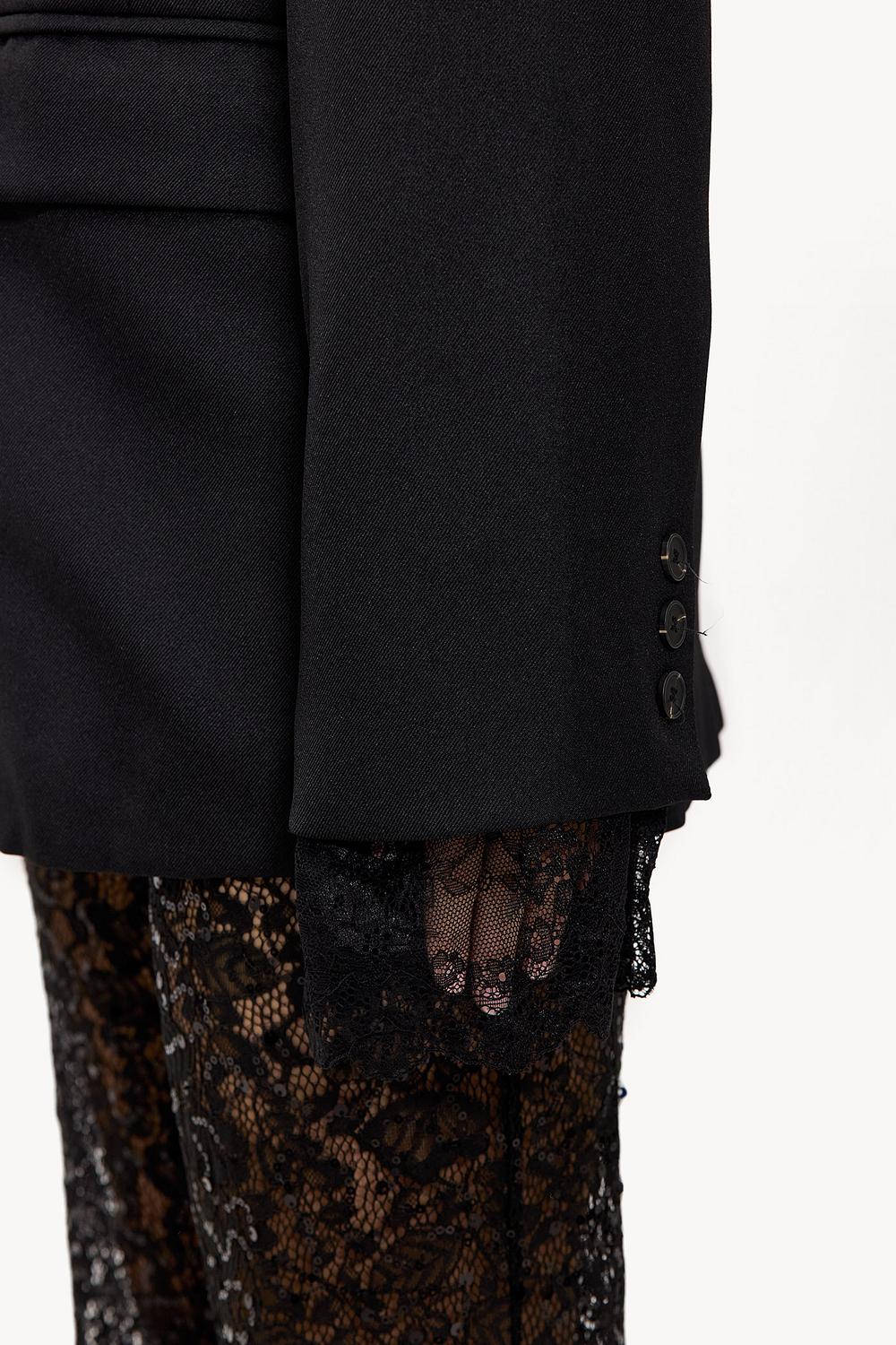 Deze zwarte oversized blazer heeft een tailored fit met statement revers en een ceintuur voor een chique touch. De lange pasvorm met subtiele lace details aan de mouwen creëert een luxe look. Style deze blazer met een zwarte lace flared broek voor een stunning all-black outfit tijdens een dinner date.