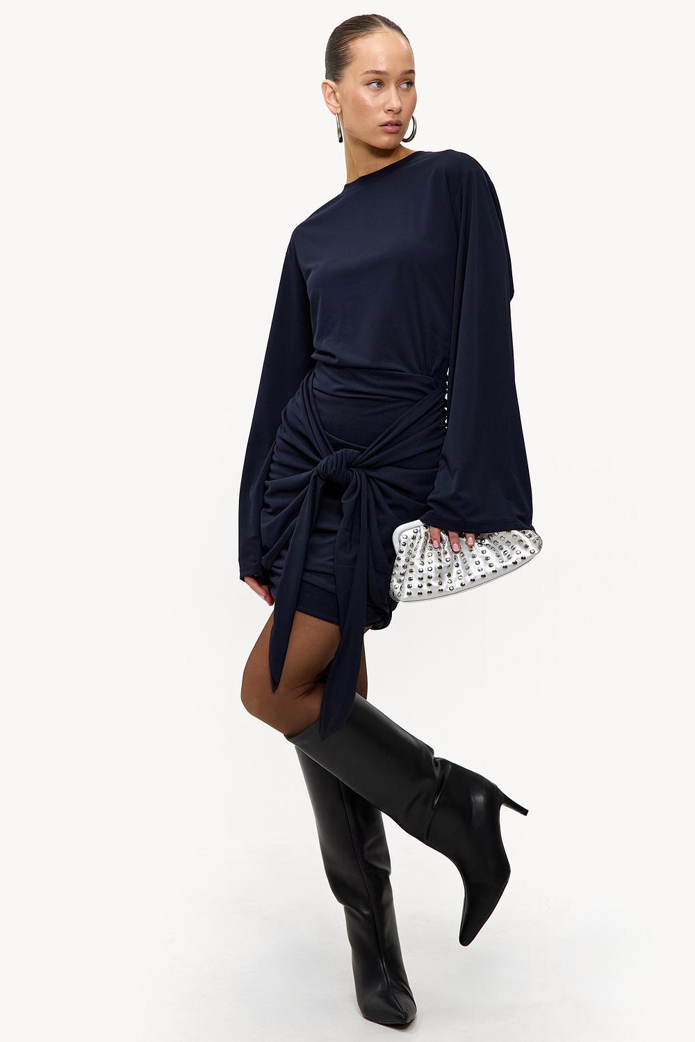 Deze navy mini dress heeft een opvallend wrap detail met strikceintuur voor een statement look. De lange mouwen en gedrapeerde pasvorm creëren een chique uitstraling met moderne twist. De bodycon fit accentueert de shape op een elegante manier. Style deze dress met hoge laarzen voor een coole city look.