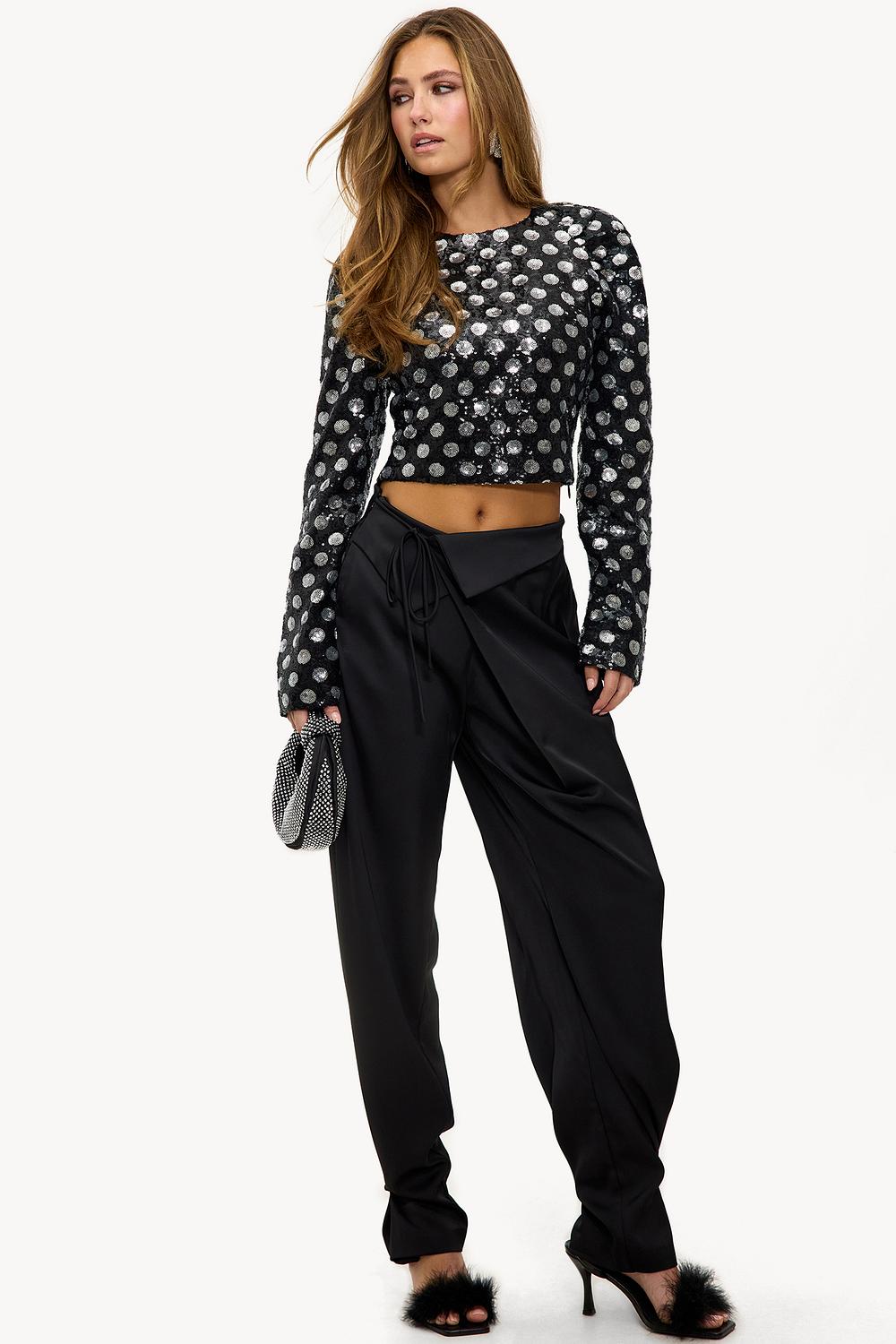 Zwarte top met stippen en sequins EUR 59,99Deze zwarte cropped longsleeve heeft een opvallende all-over polkadot print met shimmering details. De korte pasvorm met lange mouwen creëert een coole twist op het klassieke polkadot design. De glinsterende dots geven deze top een party-ready look. Style deze longsleeve met een high-waisted broek voor een chique girls night out outfit.