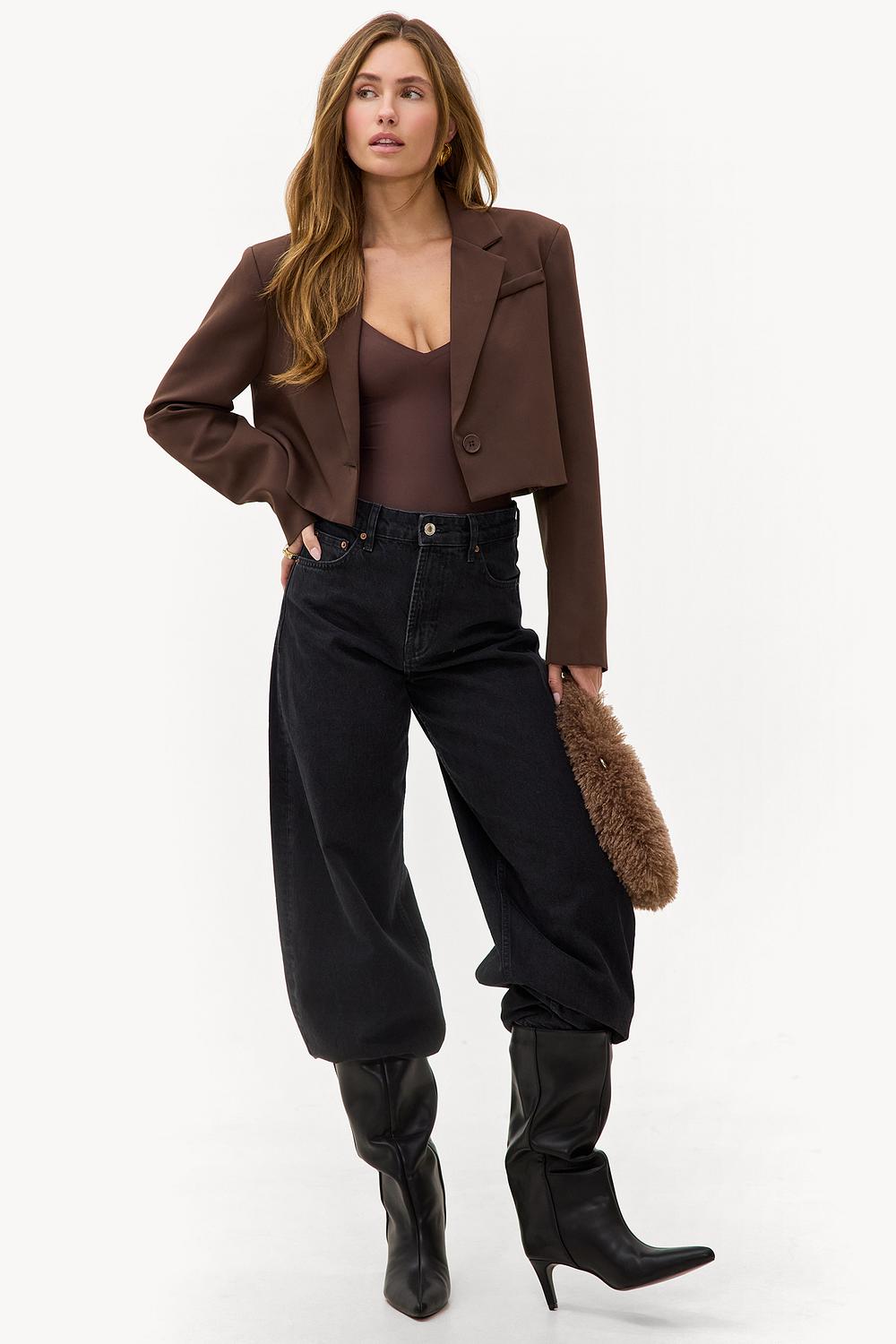 Deze donkerbruine cropped blazer heeft een tailored fit met klassieke revers en knoopsluiting. De korte pasvorm creëert een updated twist op het traditionele blazer design. Style deze blazer met de bijpassende wide leg broek voor een chique co-ord look.