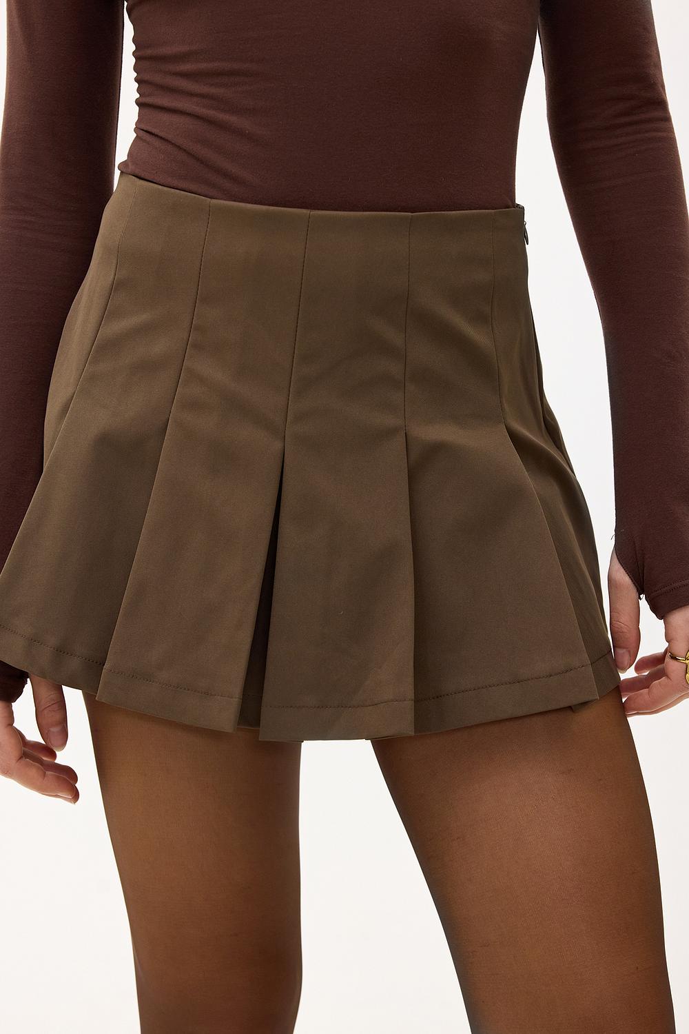 Bruine skort EUR 39,99Deze bruine mini skirt heeft een tailored fit met statement plooien voor een sophisticated look. De high-waisted pasvorm met decoratieve plissé details creëert een chique uitstraling. Style deze rok met de bijpassende blazer voor een stunning co-ord look tijdens office days.