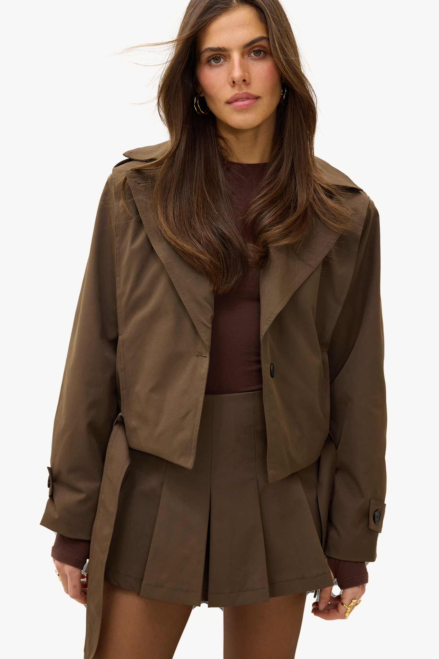 Bruine skort EUR 39,99Deze bruine mini skirt heeft een tailored fit met statement plooien voor een sophisticated look. De high-waisted pasvorm met decoratieve plissé details creëert een chique uitstraling. Style deze rok met de bijpassende blazer voor een stunning co-ord look tijdens office days.