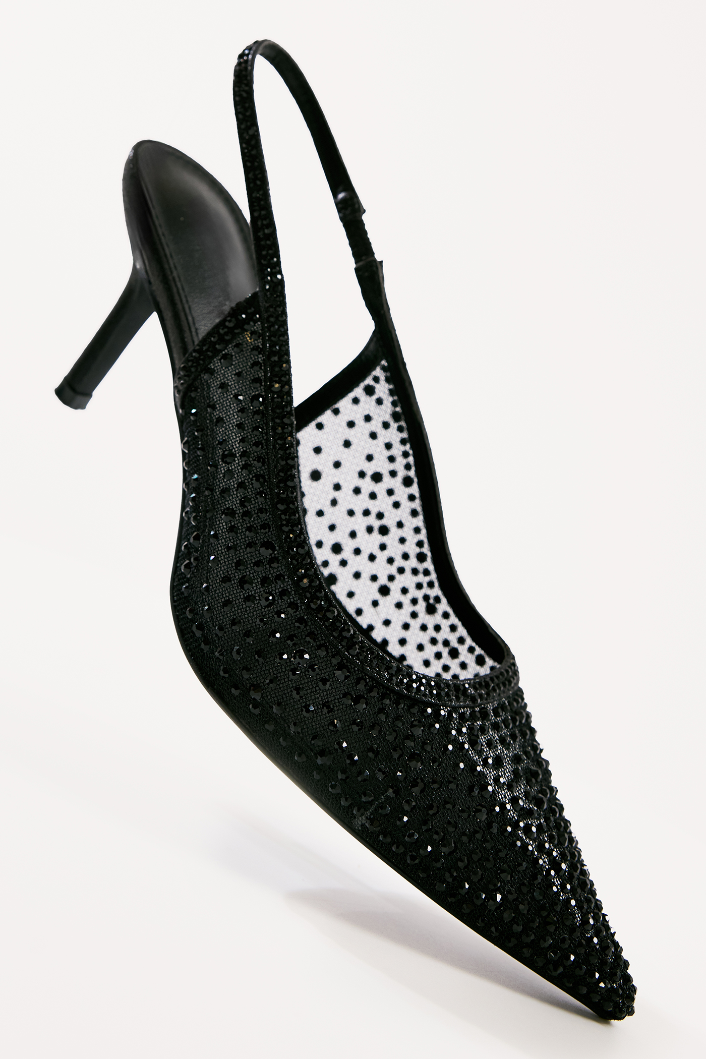 Zwarte hakken met strass stenen EUR 39,99Deze zwarte slingback pumps hebben een luxe mesh design met shiny studs all over. De pointed toe en elegante hak creëren een sophisticated look. De transparante mesh details geven deze pumps een moderne twist. Style ze met een little black dress voor een iconic dinner date.